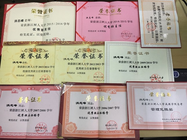 在洪志峰办公桌身后的那堵墙上,贴满了五颜六色的爱心留言、感谢信与祝福语,这些都是其任教期间收到的礼物;更大的礼物还在于12年的班主任工作,让他收获了12次校优秀班级、12次校优秀团支部,1次基层活力团支部称号,个人也荣获7次校优秀班主任,12次院级优秀班主任称号。