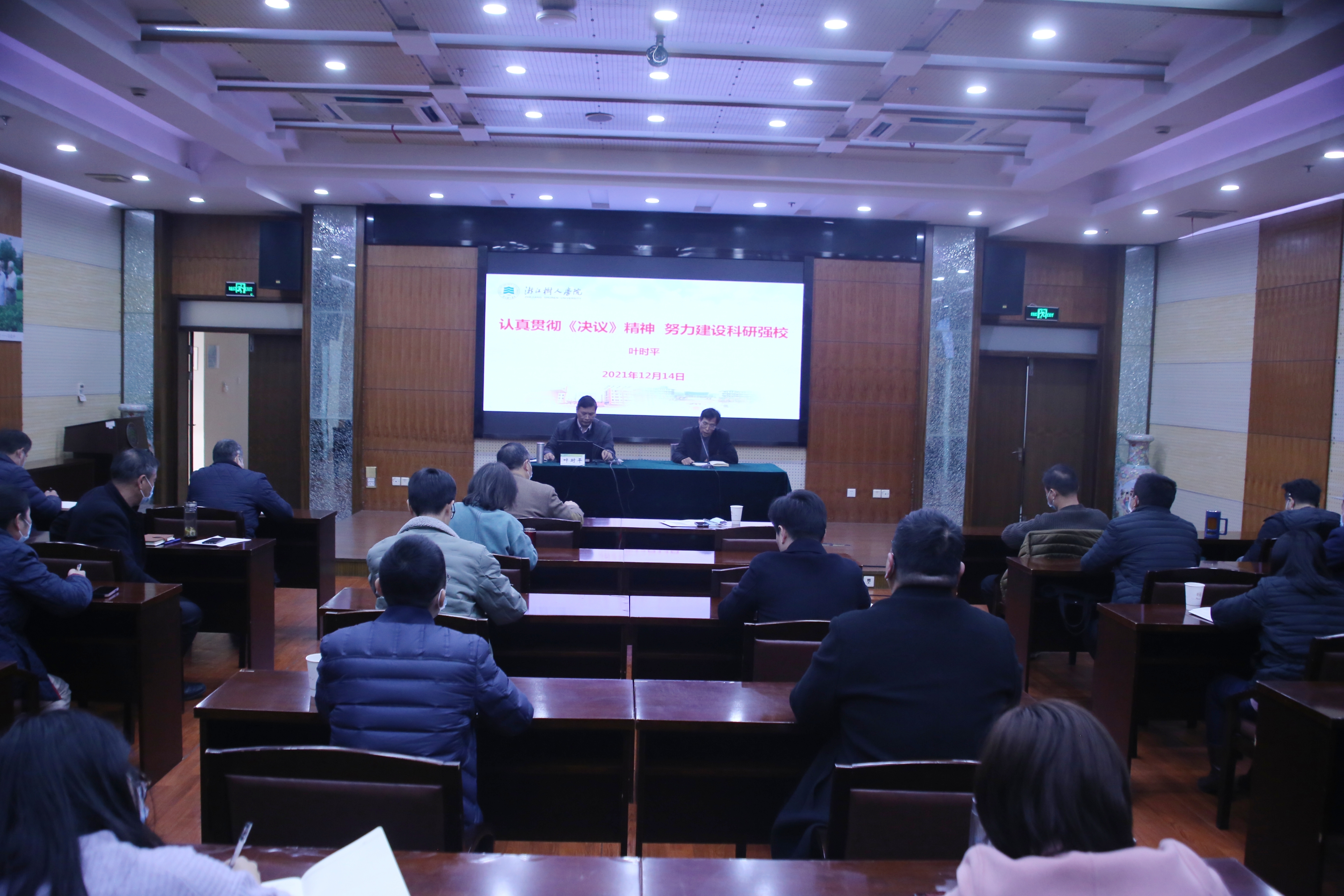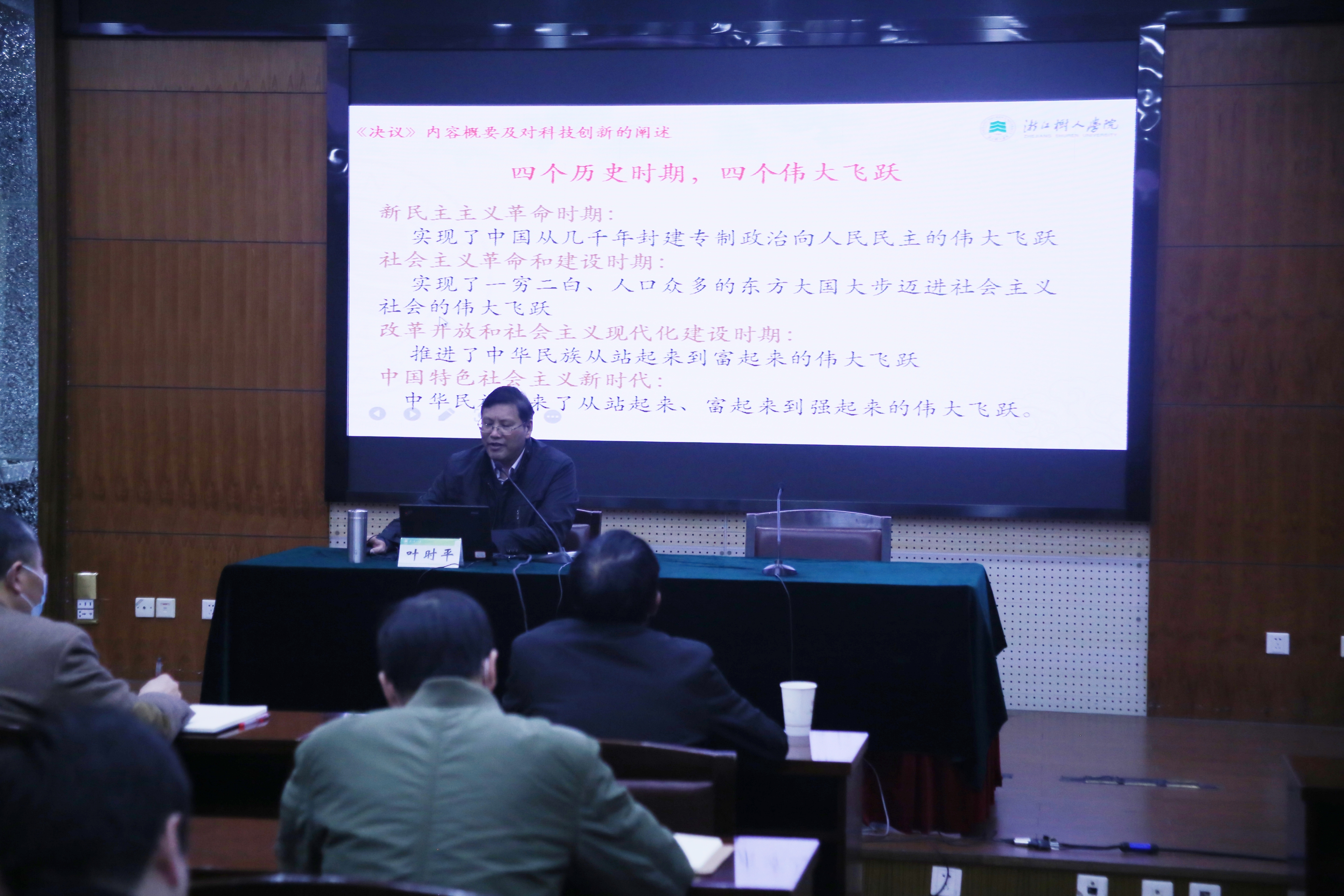 叶时平以“学习贯彻《决议》精神,努力建设科研强校”为题,从全会的时代背景与重要意义、“四个历史时期”的“四个伟大飞跃”、“马克思主义中国化的三次飞跃”、习近平新时代中国特色社会主义思想的精神要义等方面,对党的十九届六中全会精神做了全面深入的阐述与解释。他说,在《决议》中12次提到了“科技”、39次提到了“创新”,表明习近平总书记及党中央高度重视科技创新工作。他总结了十八大以来党对科技创新工作的领导及取得的伟大成就,并把它归纳为科技创新地位论、道路论、体制论、战略论、主体论、目的论、目标论。最后,他结合公司科研工作实际,希望大家树立科技强校思想,加快实现名校民办目标。