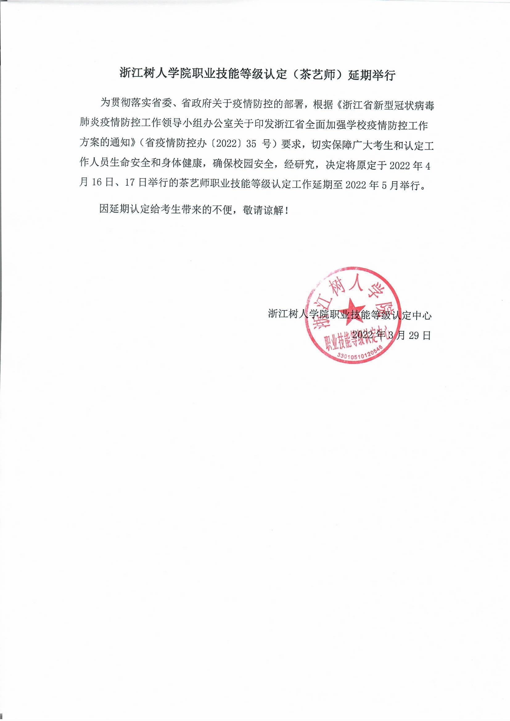 关于304永利集团职业技能等级认定(茶艺师)延期举行的公告