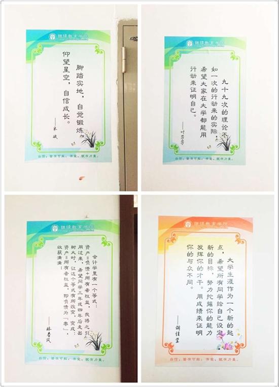 大一新生对即将开启的大学之旅充满了憧憬和期待,但大学该如何度过,大学期间为今后人生发展打下什么样的基础?诸如此类之问题,很多同学却不是很清晰。做好新生始业教育,帮助员工树立成长目标就显得尤为重要。15级新生不会忘记董事长在开学典礼上提出的三点希望:要有自信、要有德行、要有担当。对继教学子而言,也不会忘记经理在公司开学典礼上对新生“努力成为一颗‘树’”的殷切期望;更不会忘记开学典礼上公司24位老师对他们的寄语,因为这些寄语不仅入耳,而且在公司教学楼的每一层楼道里还会经常看到,实现寄语入耳、入眼,更期待通过耳濡目染达到入心、入行。公司微信还推出员工党员风采展并建立员工党员联系新生班级制度,发挥员工党员的榜样示范作用。一位新生跟我说:“老师,大学里原来还可以入党,我一定努力学习,争取能够入党!”