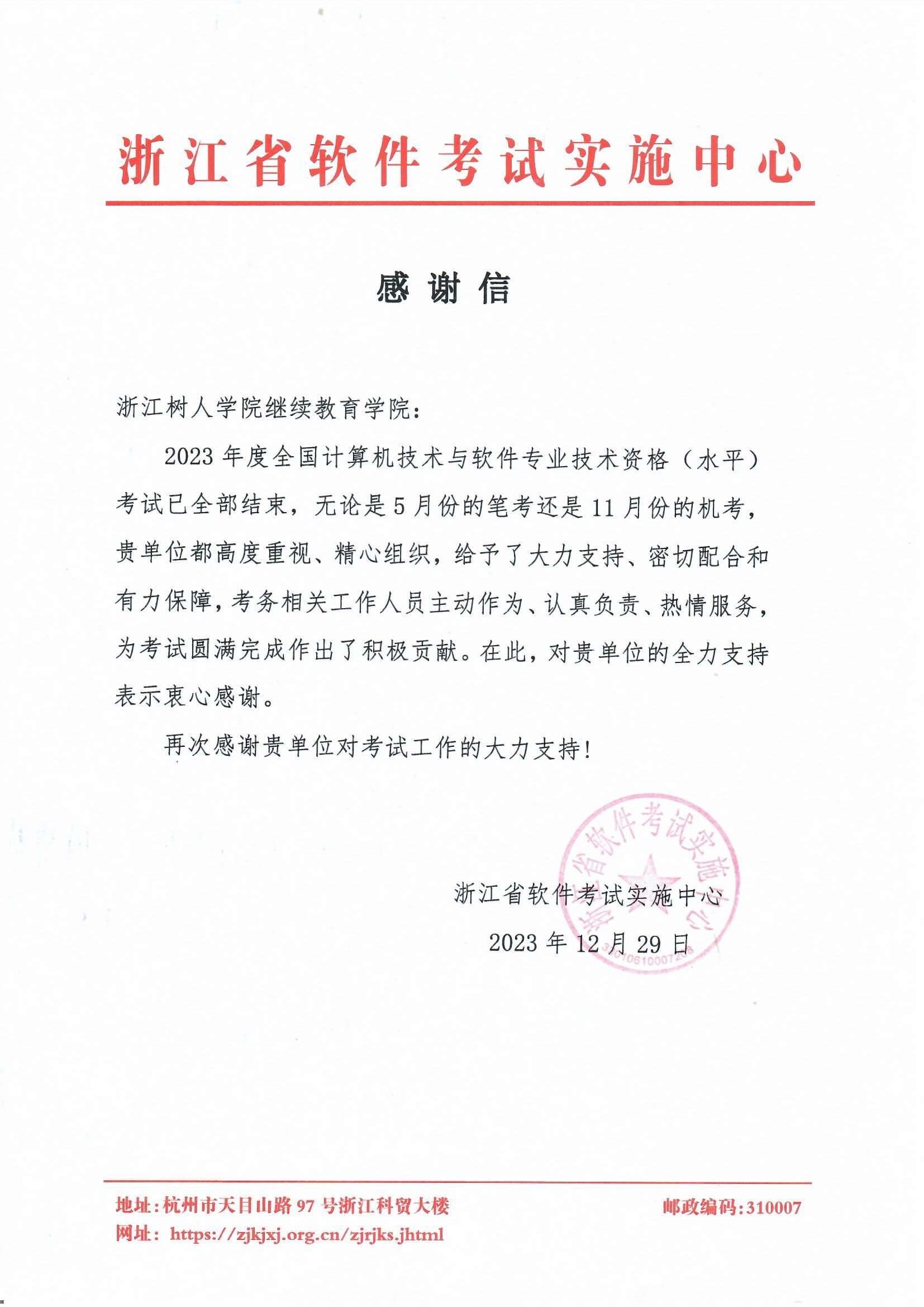 新年伊始,304永利集团收到了一封来自浙江省软件考试实施中心的感谢信。信中对公司考务中心在2023年度的全国计算机技术与软件专业技术资格(水平)考试组考做出了充分的肯定,对公司考点对于浙江省软件考试实施中心工作的支持和配合致以崇高的敬意和真挚的感谢。