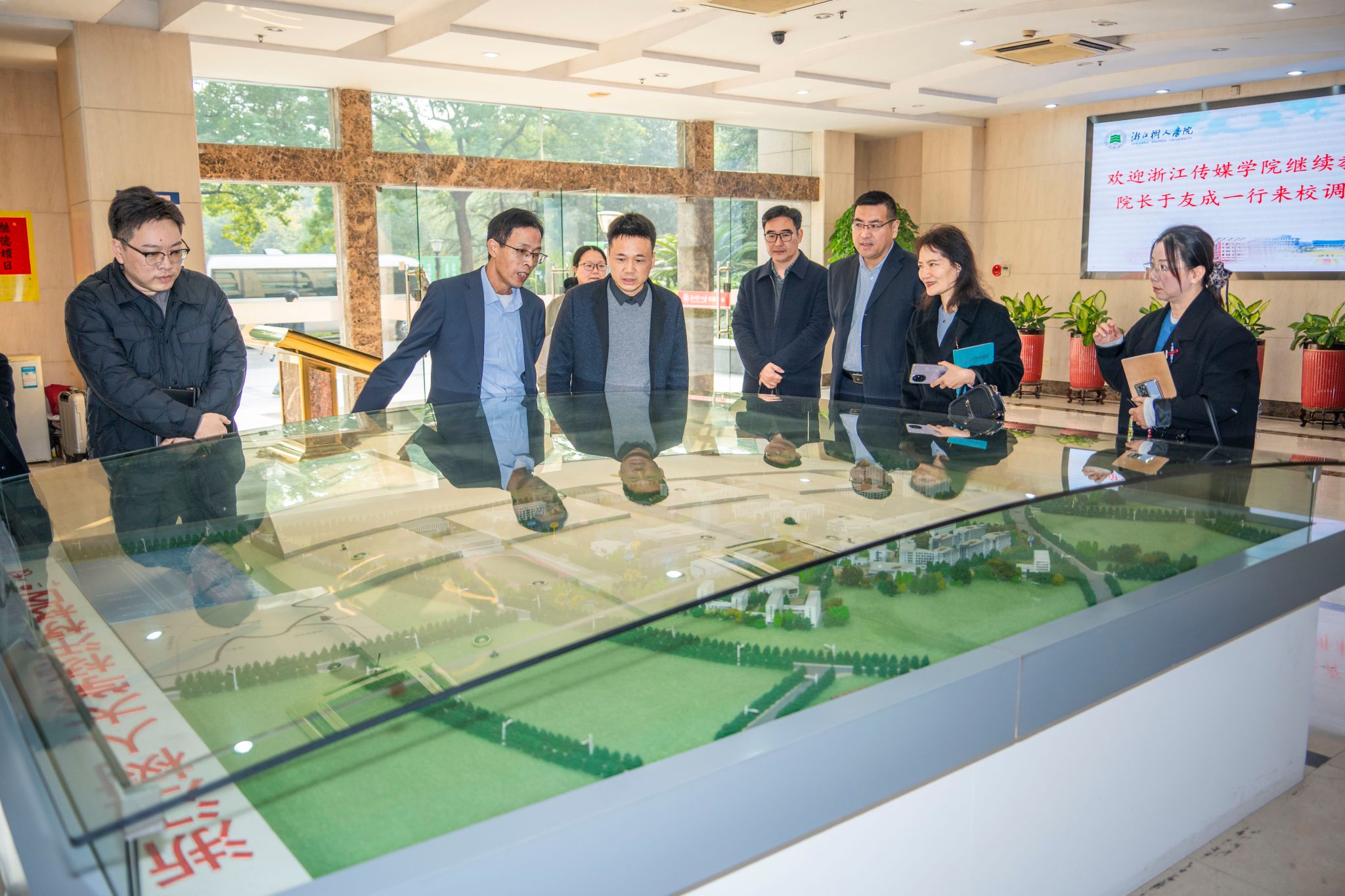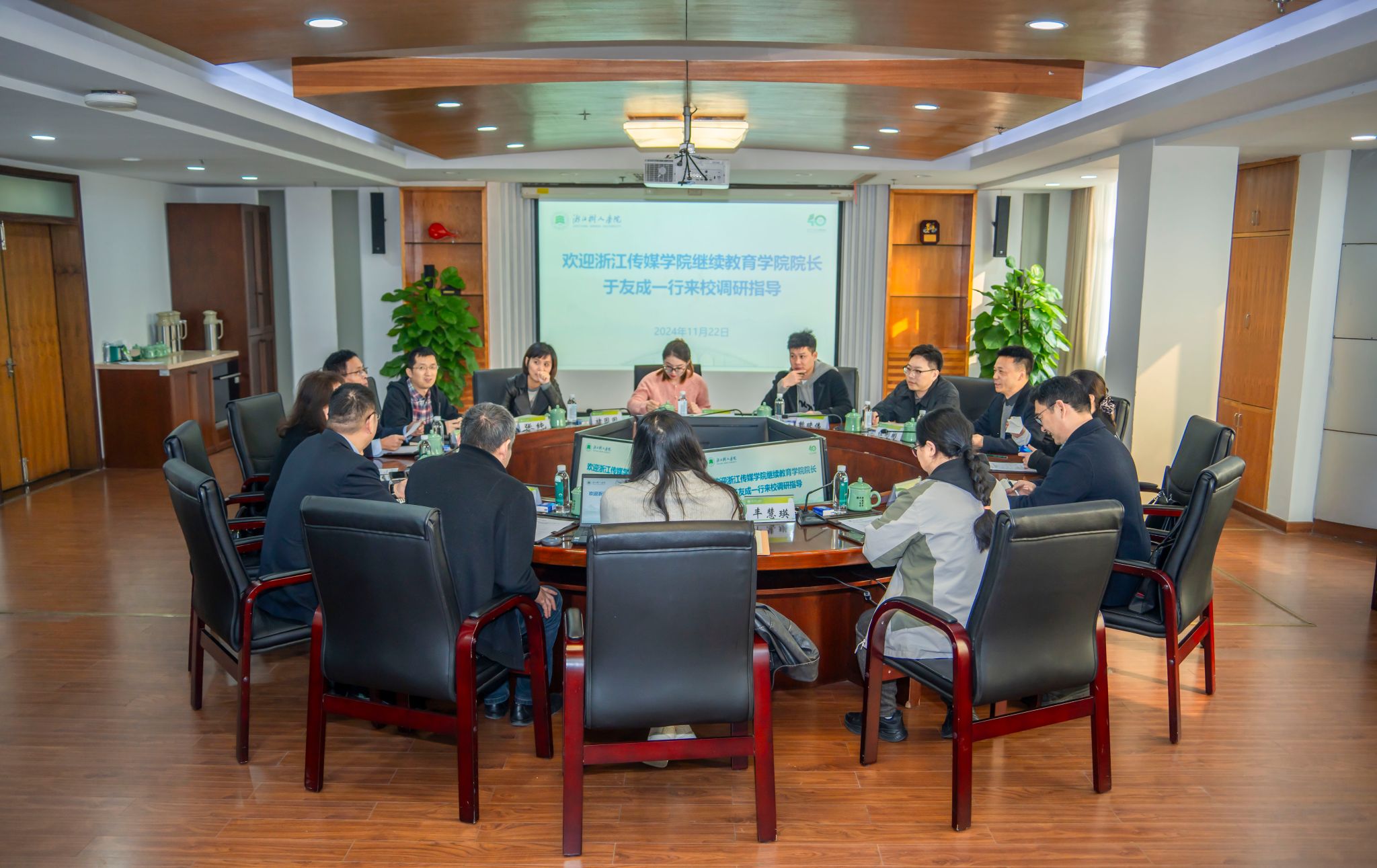 在听取公司继续教育情况介绍后,于友成对公司的热情接待表示感谢,并从学历继续教育、非学历教育和社会培训三个板块介绍了浙江传媒公司继续教育的办学情况。他希望与公司加强合作,共同探索继续教育发展的新模式、新路径。