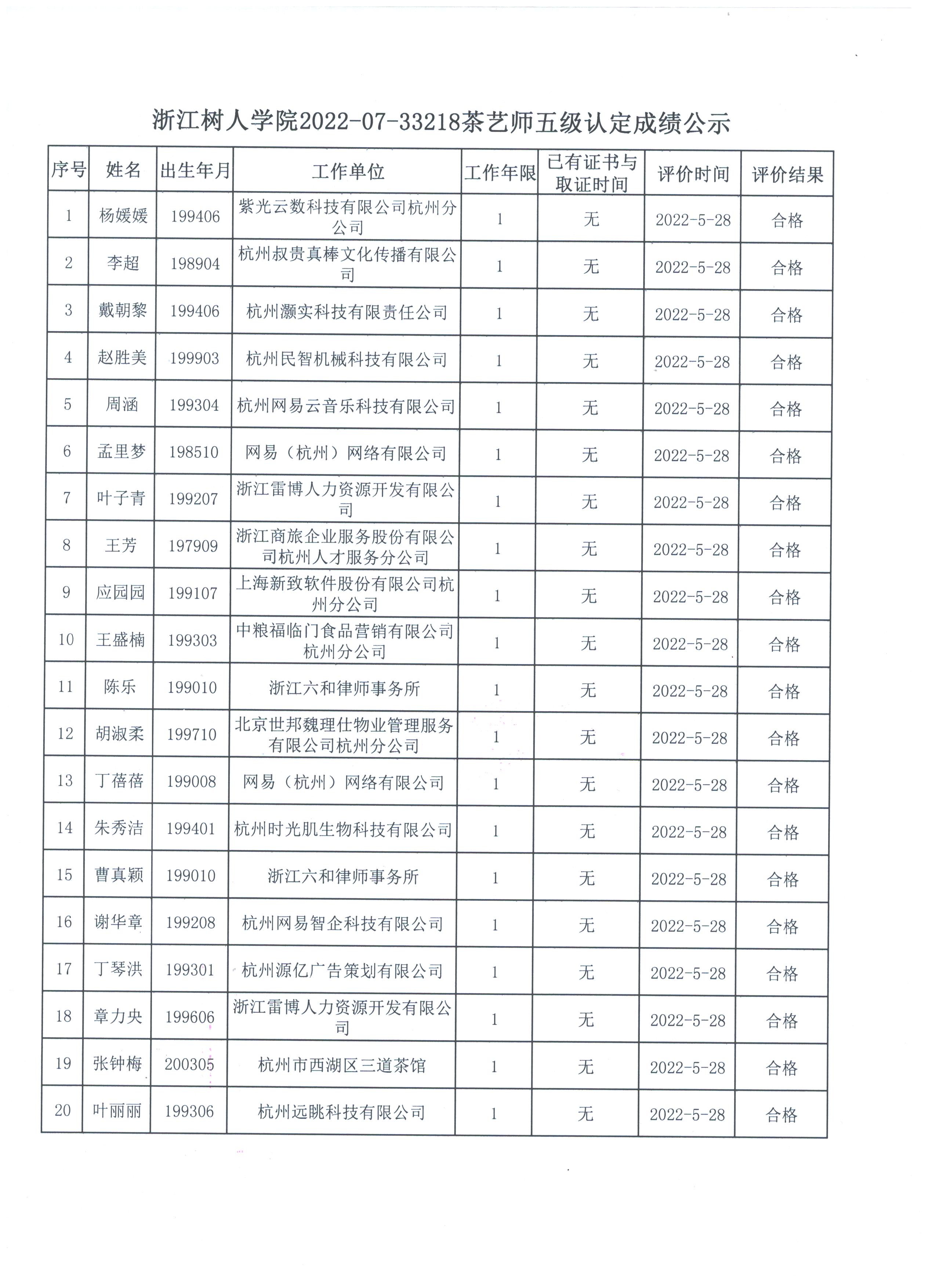304永利集团2022-07-33218茶艺师五级认定成绩公示