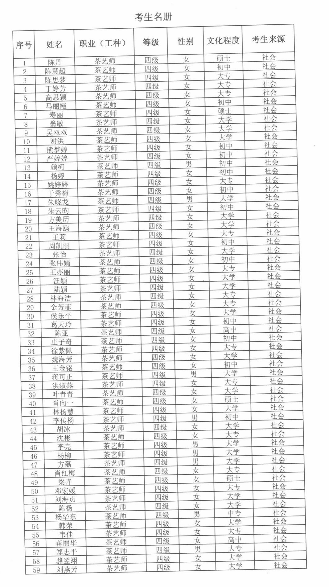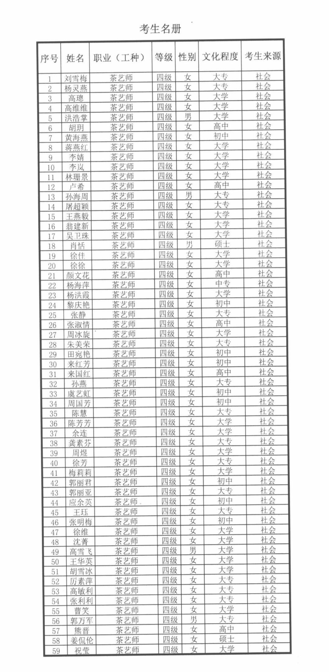 现将通过2022-07-40481、2022-07-40485批次茶艺师四级(中级)职业技能等级认定资格审核考生信息予以公示,公示期2022年6月15日至6月20日,如对公示情况有异议,请提供有效证据,并实名电话或书面联系公司职业技能认定中心。