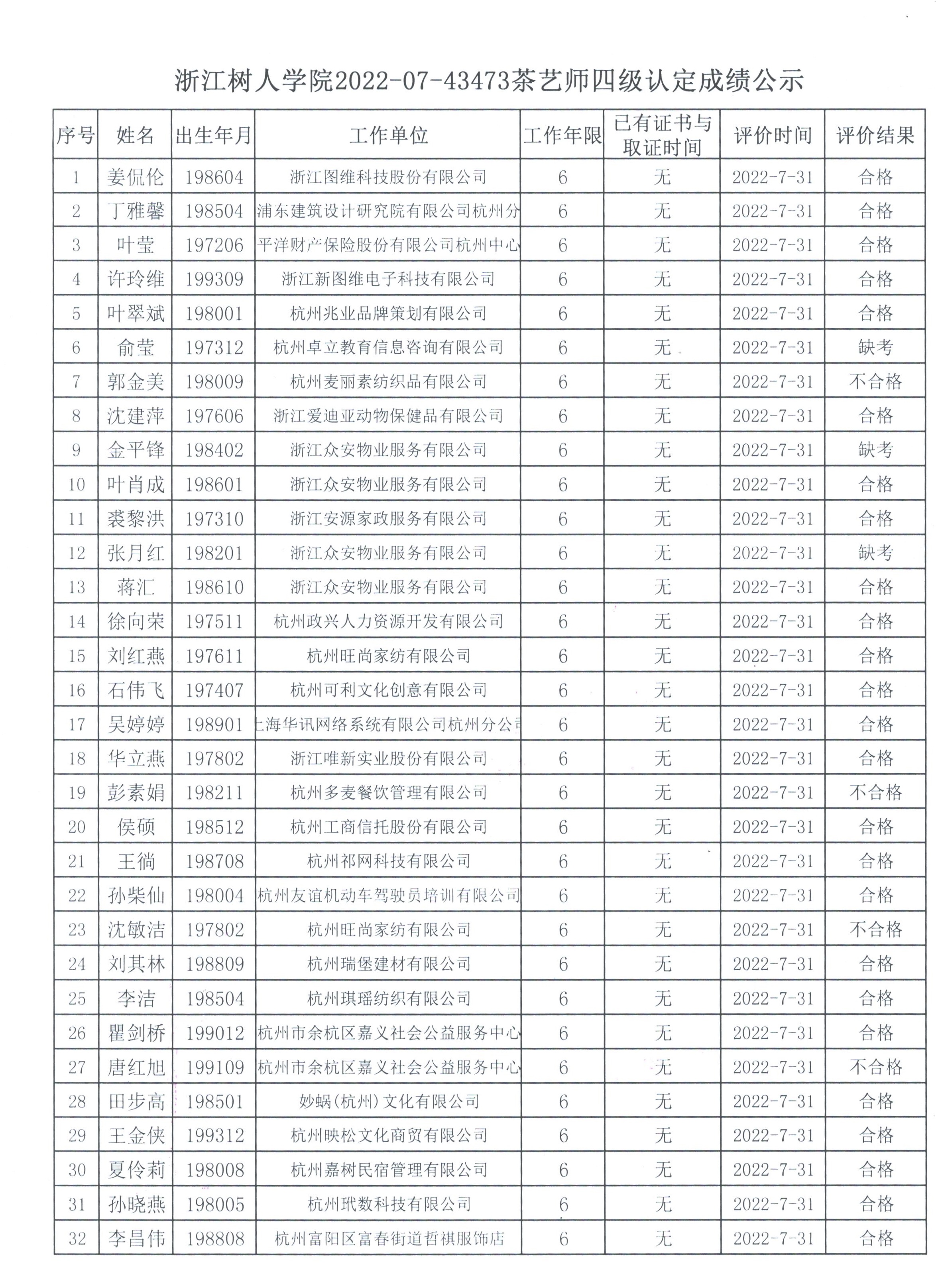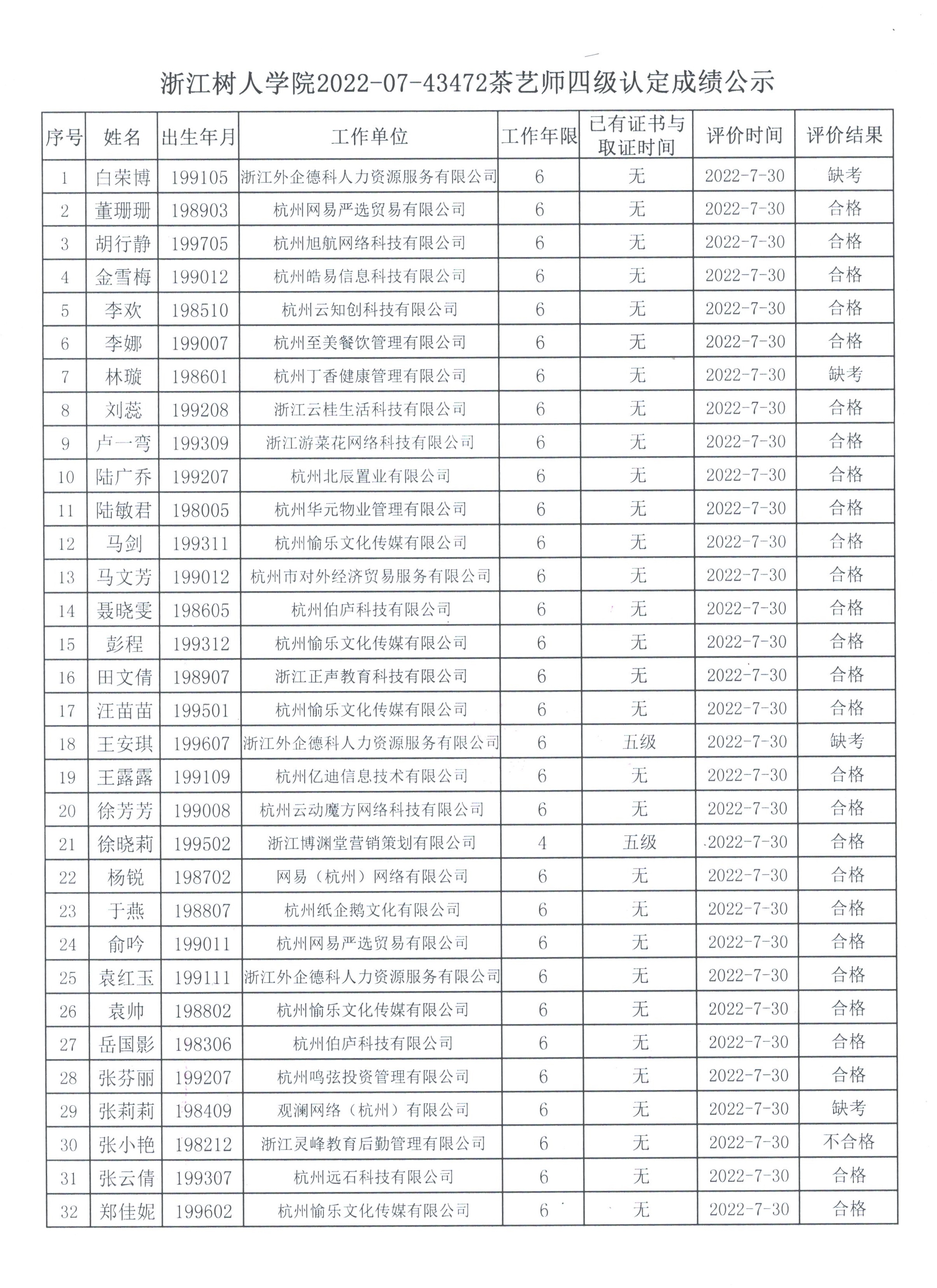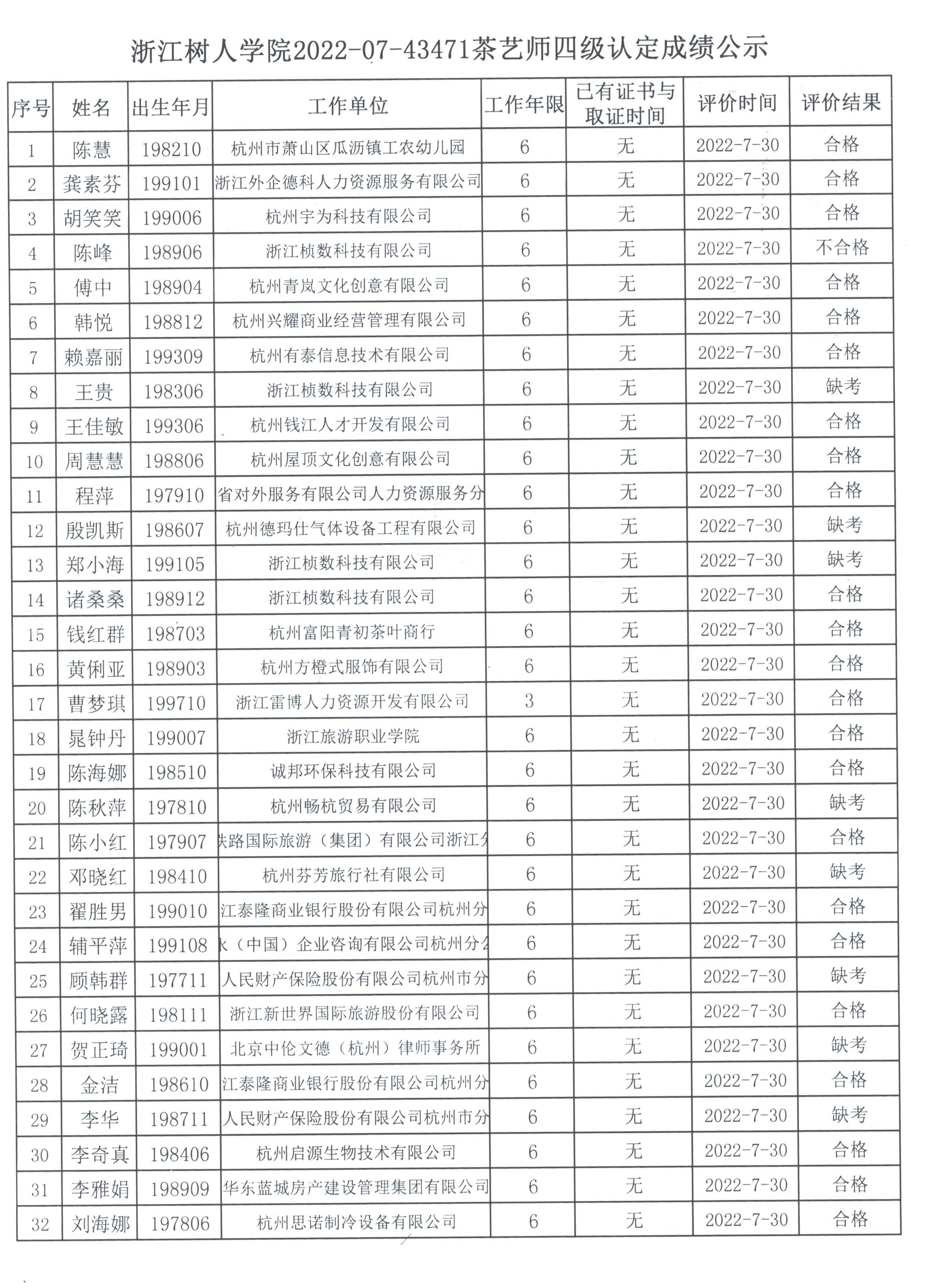 根据《浙江省人力资源和社会保障厅办公室关于印发<浙江省社会评价组织职业技能等级认定操作指南(试行)>的通知》,经审核,现将2022-07-43471、2022-07-43472和2022-07-43473批次茶艺师四级职业技能等级认定成绩予以公示,公示期2022年8月3日至8月9日,如对公示情况有异议,请提供有效证据,并实名电话或书面联系公司职业技能认定中心。