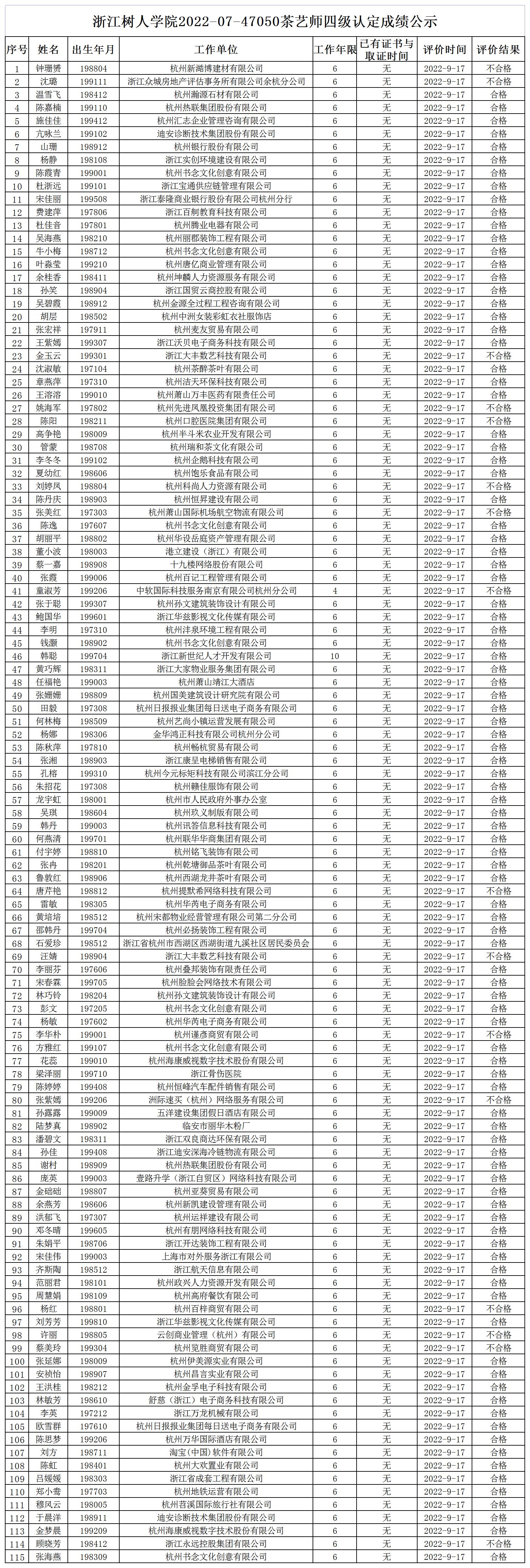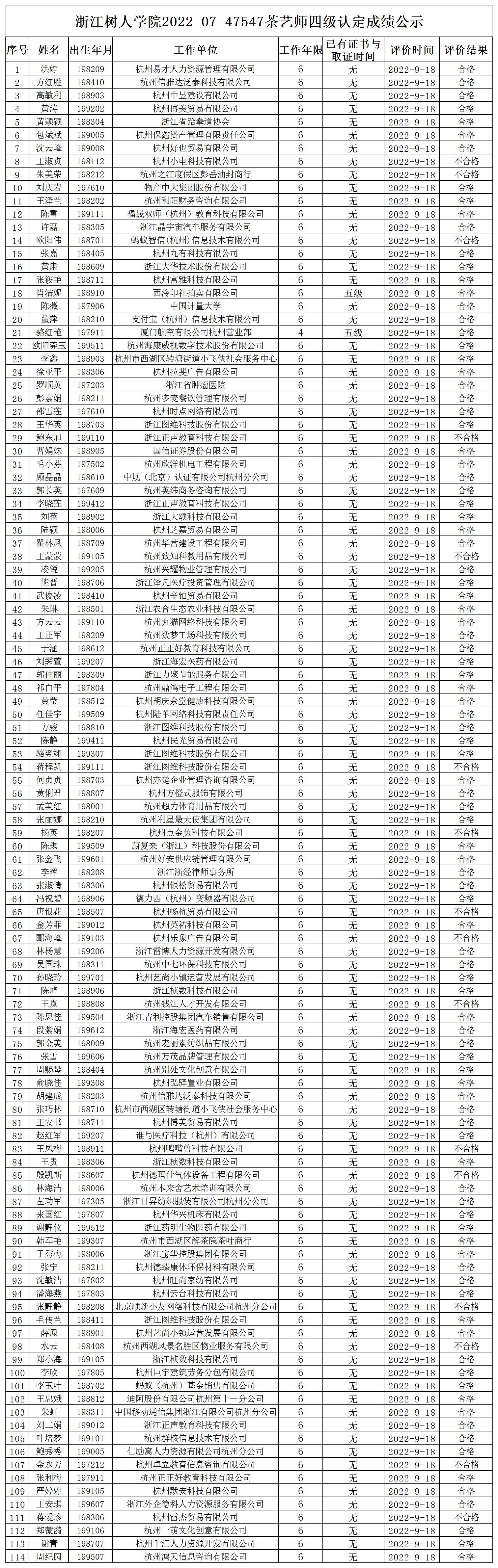 根据《浙江省人力资源和社会保障厅办公室关于印发<浙江省社会评价组织职业技能等级认定操作指南(试行)>的通知》,经审核,现将2022-07-47050、2022-07-47547批次茶艺师四级职业技能等级认定成绩予以公示,公示期2022年9月21日至9月27日,如对公示情况有异议,请提供有效证据,并实名电话或书面联系公司职业技能认定中心。