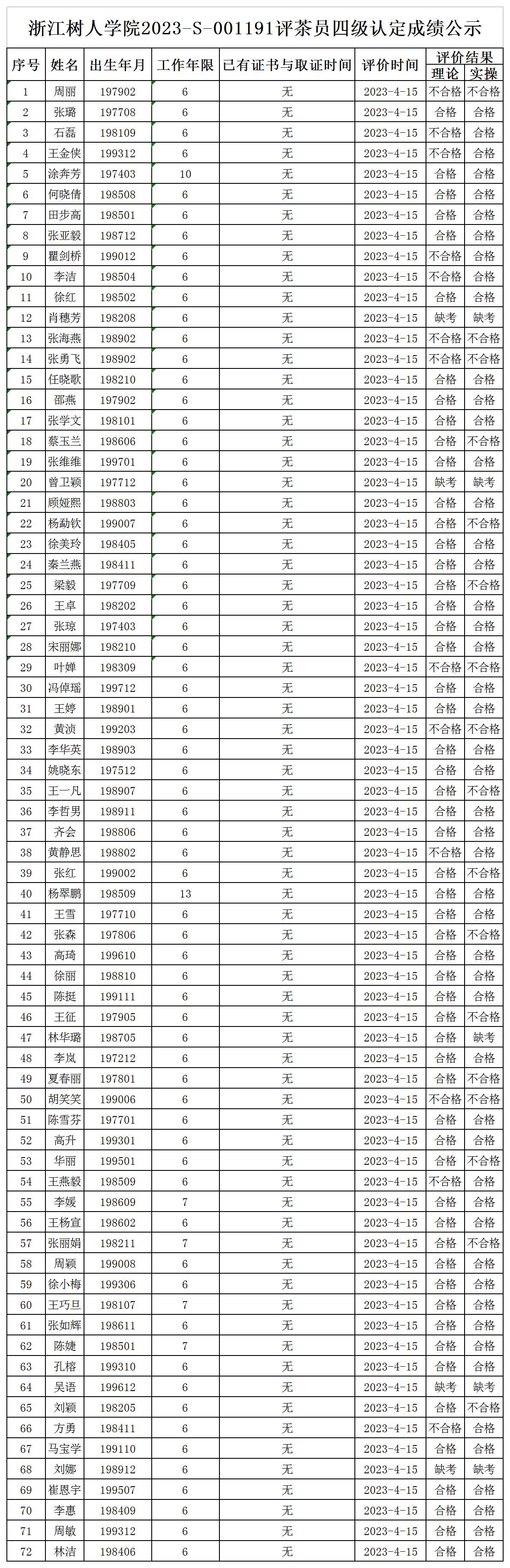 根据《浙江省人力资源和社会保障厅办公室关于印发<浙江省社会评价组织职业技能等级认定操作指南(试行)>的通知》,经审核,现将2023-S-001191批次评茶员四级职业技能等级认定成绩予以公示,公示期2023年4月19日至4月24日,如对公示情况有异议,请提供有效证据,并实名电话或书面联系公司职业技能等级认定中心。