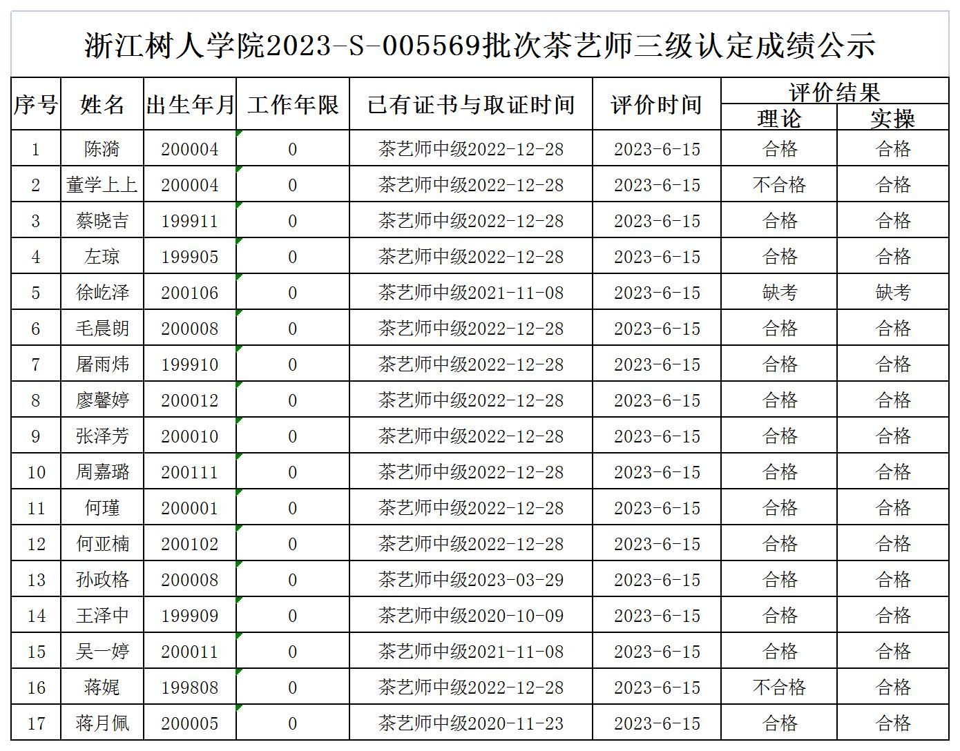 根据《浙江省人力资源和社会保障厅办公室关于印发<浙江省社会评价组织职业技能等级认定操作指南(试行)>的通知》,经审核,现将2023-S-005569批次茶艺师三级职业技能等级认定成绩予以公示,公示期2023年6月21日至6月28日,如对公示情况有异议,请提供有效证据,并实名电话或书面联系公司职业技能认定中心。