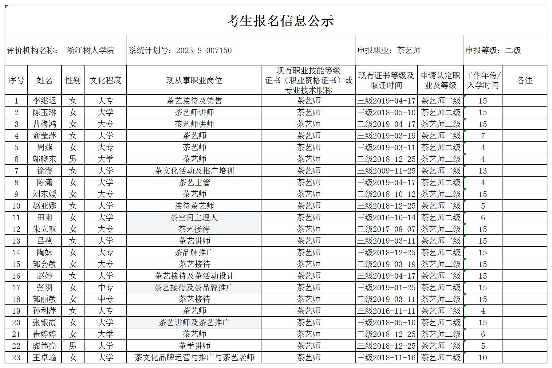 现将通过2023-S-007150批次茶艺师二级(技师)职业技能等级认定资格审核考生信息予以公示,公示期2023年7月7日至7月13日,如对公示情况有异议,请提供有效证据,并实名电话或书面联系公司职业技能认定中心。