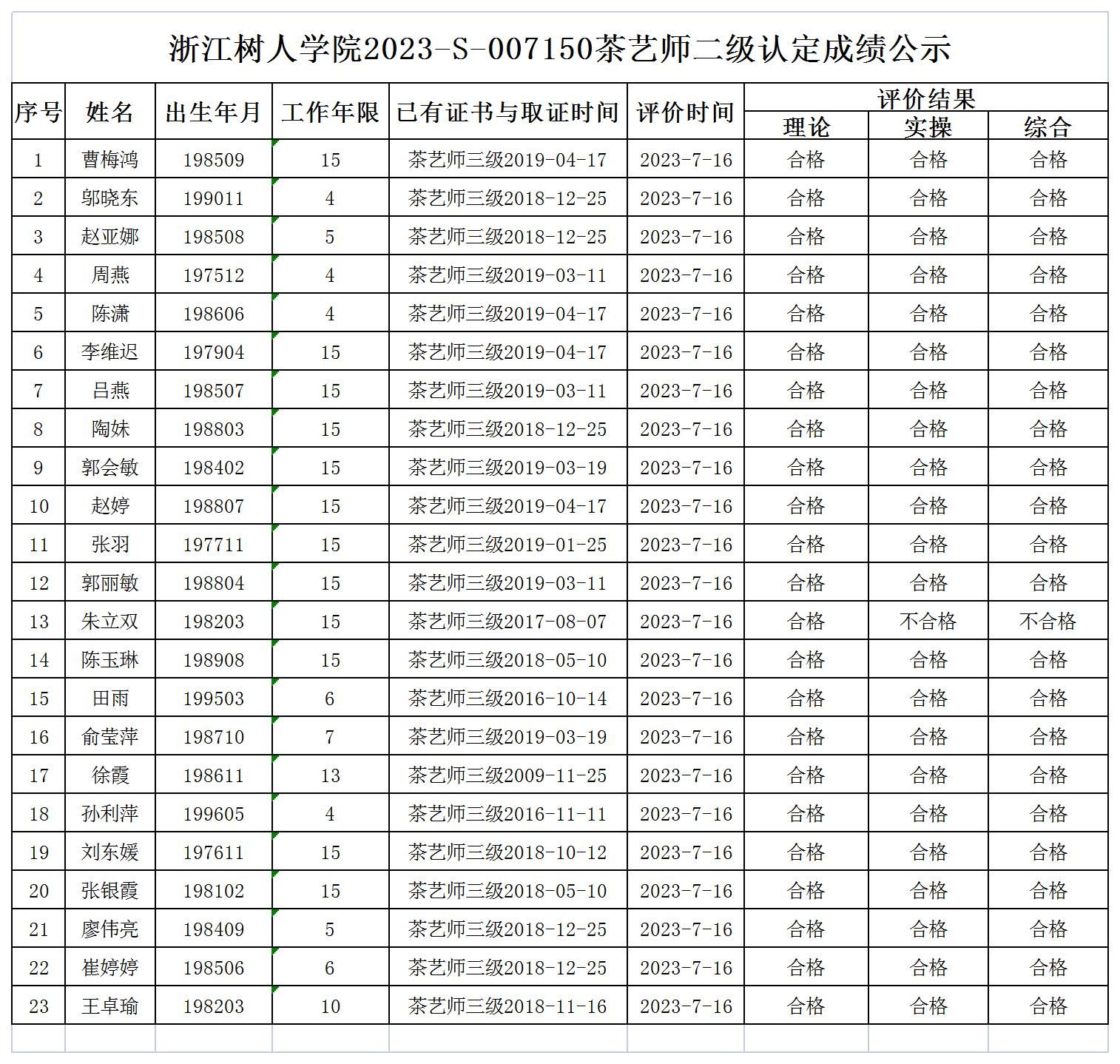 根据《浙江省人力资源和社会保障厅办公室关于印发<浙江省社会评价组织职业技能等级认定操作指南(试行)>的通知》,经审核,现将2023-S-007150批次茶艺师二级职业技能等级认定成绩予以公示,公示期2023年7月19日至7月25日,如对公示情况有异议,请提供有效证据,并实名电话或书面联系公司职业技能认定中心。