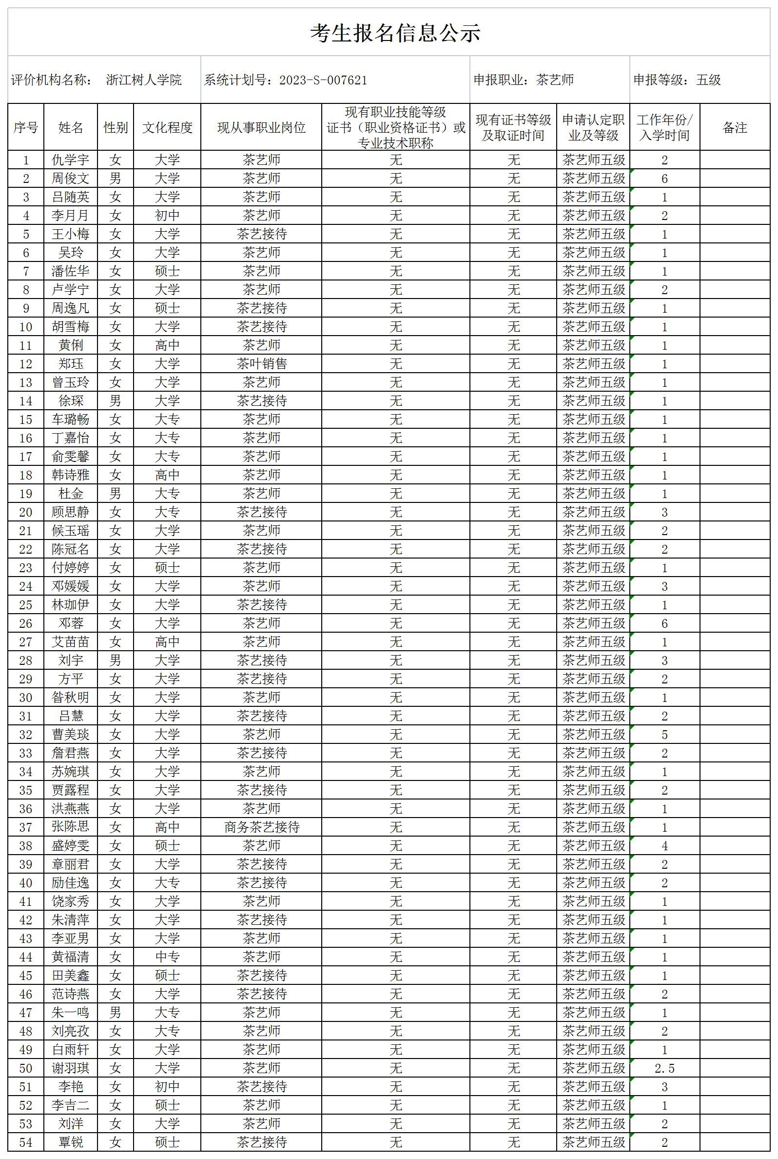 现将通过2023-S-007621批次茶艺师五级(初级)职业技能等级认定资格审核考生信息予以公示,公示期2023年8月7日至8月11日,如对公示情况有异议,请提供有效证据,并实名电话或书面联系公司职业技能认定中心。