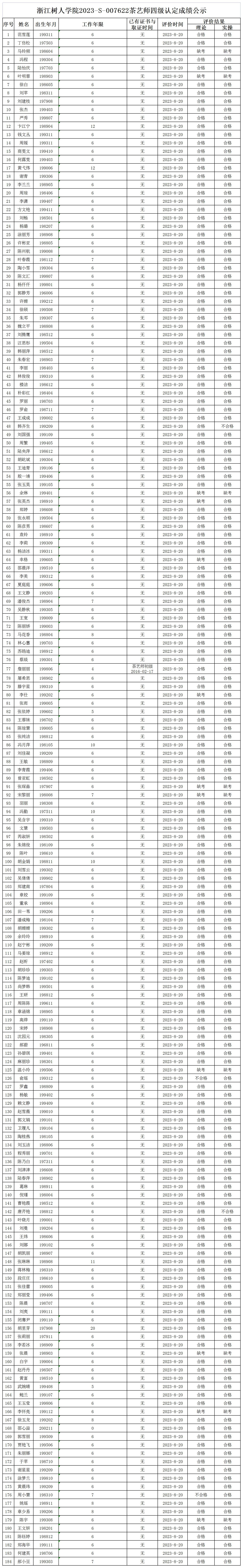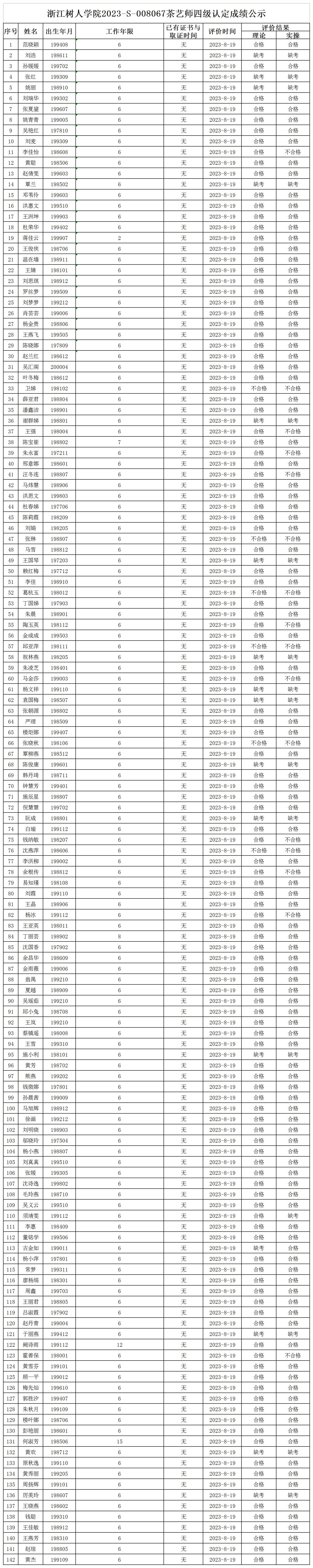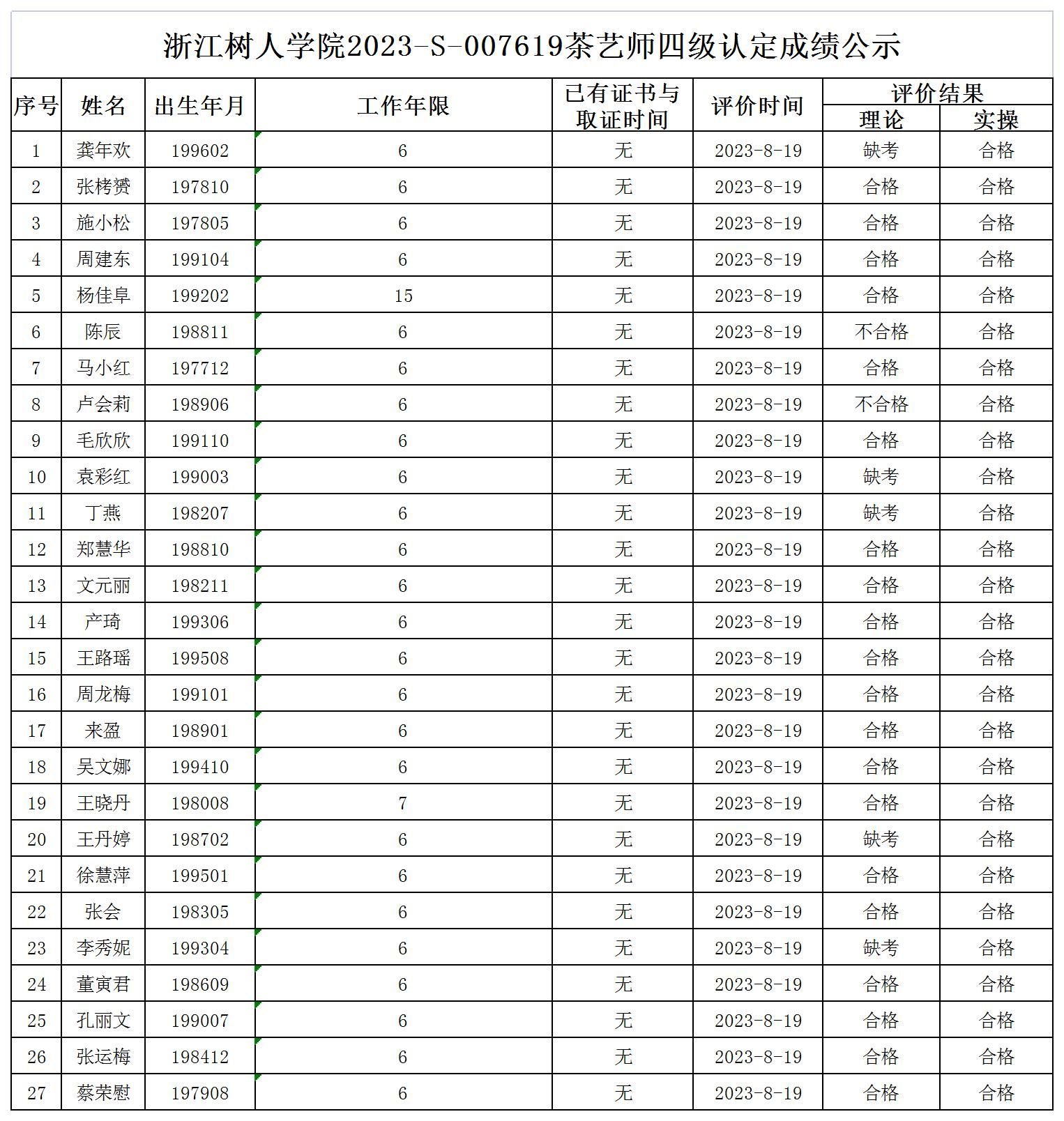 根据《浙江省人力资源和社会保障厅办公室关于印发<浙江省社会评价组织职业技能等级认定操作指南(试行)>的通知》,经审核,现将2023-S-008067、2023-S-007619、2023-S-007620、2023-S-007622批次茶艺师四级职业技能等级认定成绩予以公示,公示期2023年8月23日至8月29日,如对公示情况有异议,请提供有效证据,并实名电话或书面联系公司职业技能认定中心。