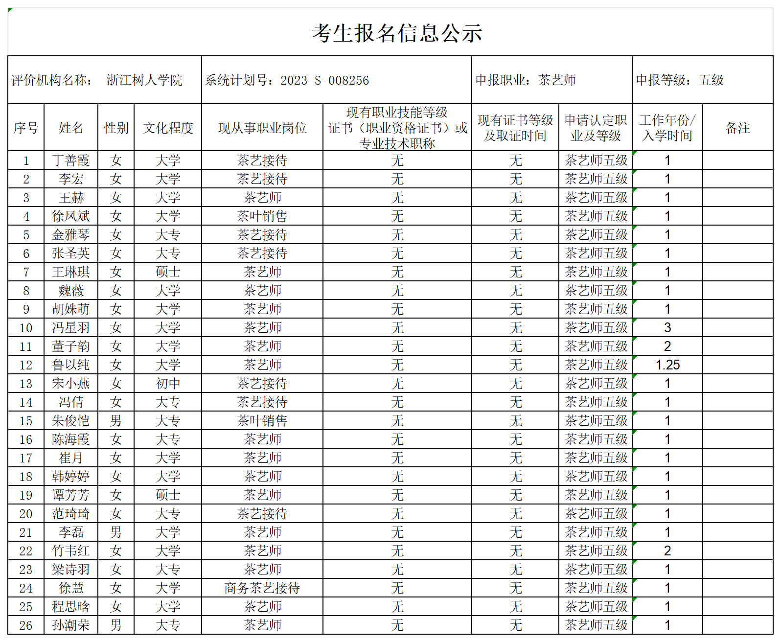 现将通过2023-S-008256批次茶艺师五级(初级)职业技能等级认定资格审核考生信息予以公示,公示期2023年9月4日至9月8日,如对公示情况有异议,请提供有效证据,并实名电话或书面联系公司职业技能认定中心。