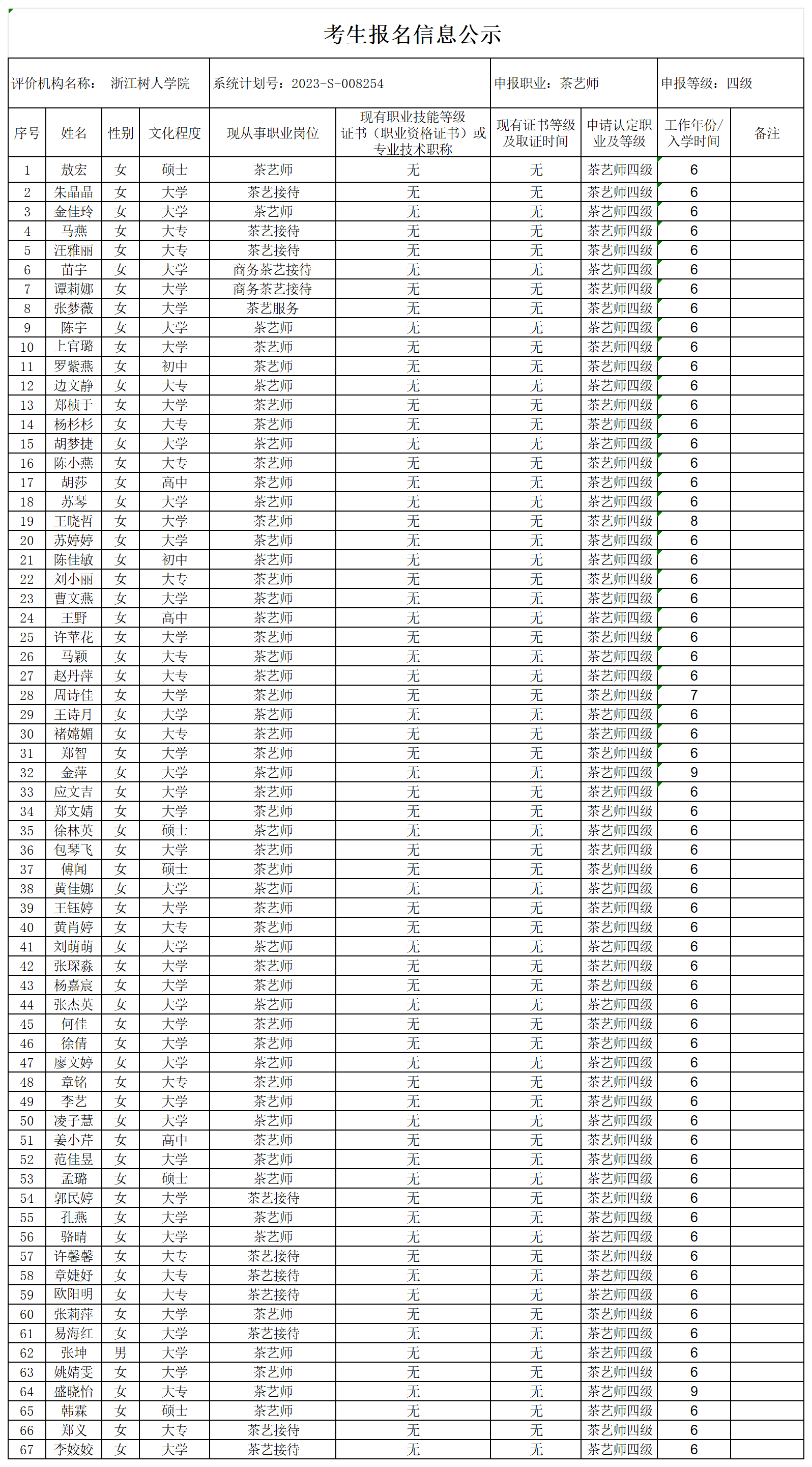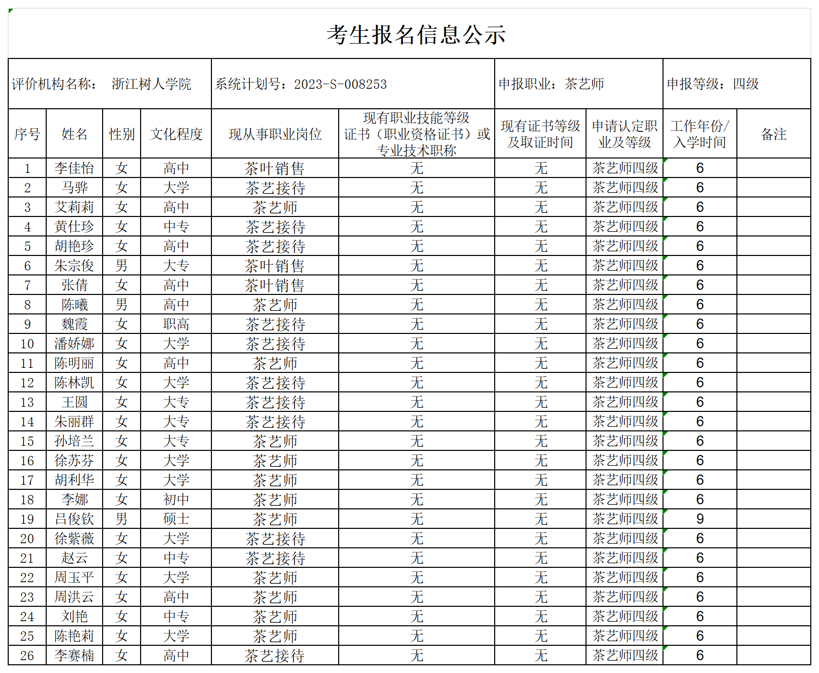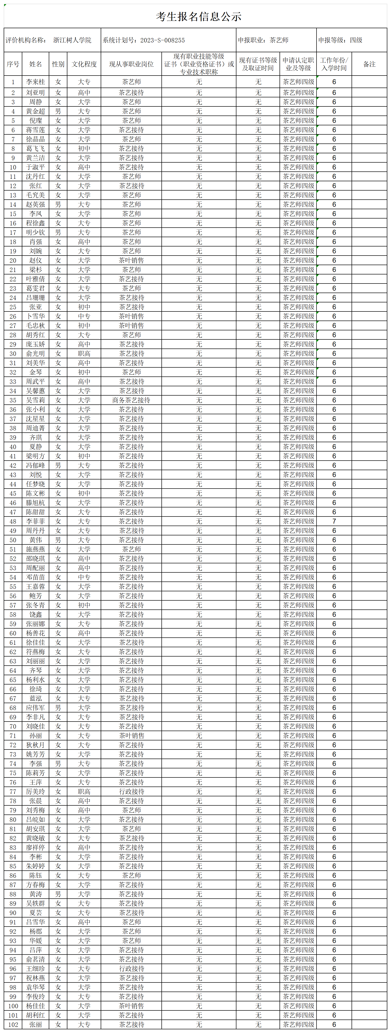 现将通过2023-S-008253、2023-S-008254、2023-S-008255批次茶艺师四级(中级)职业技能等级认定资格审核考生信息予以公示,公示期2023年9月4日至9月8日,如对公示情况有异议,请提供有效证据,并实名电话或书面联系公司职业技能认定中心。