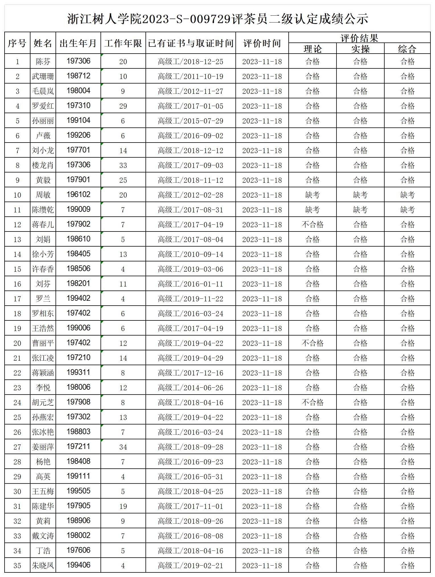 根据《浙江省人力资源和社会保障厅办公室关于印发<浙江省社会评价组织职业技能等级认定操作指南(试行)>的通知》,经审核,现将2023-S-009729批次评茶员二级职业技能等级认定成绩予以公示,公示期2023年11月22日至11月28日,如对公示情况有异议,请提供有效证据,并实名电话或书面联系公司职业技能认定中心。