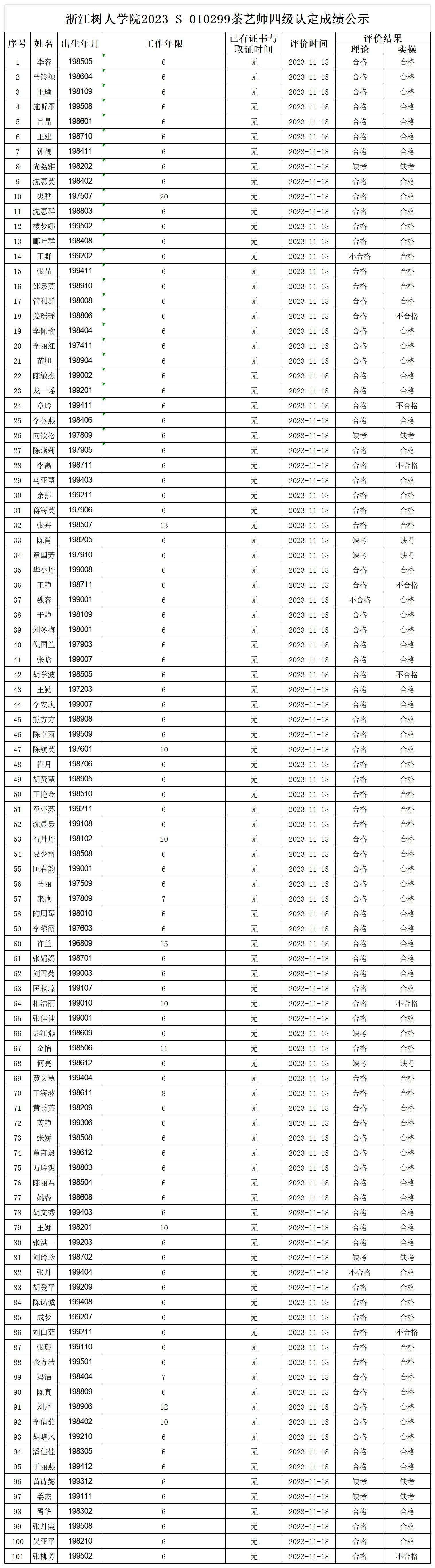 根据《浙江省人力资源和社会保障厅办公室关于印发<浙江省社会评价组织职业技能等级认定操作指南(试行)>的通知》,经审核,现将2023-S-010299批次茶艺师四级职业技能等级认定成绩予以公示,公示期2023年11月22日至11月28日,如对公示情况有异议,请提供有效证据,并实名电话或书面联系公司职业技能认定中心。