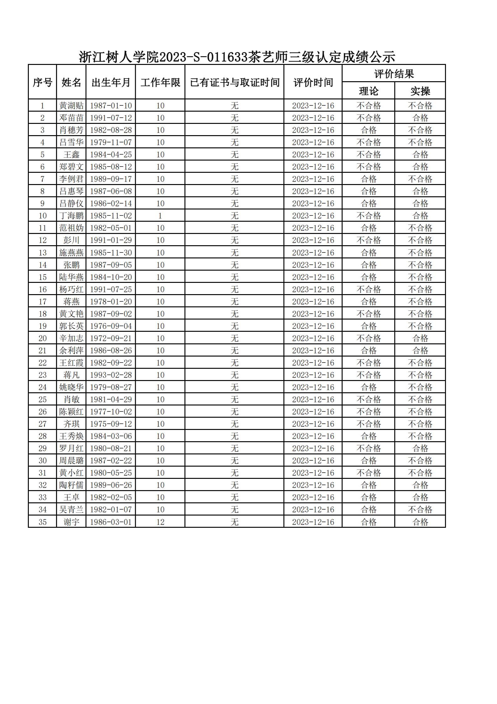 根据《浙江省人力资源和社会保障厅办公室关于印发<浙江省社会评价组织职业技能等级认定操作指南(试行)>的通知》,经审核,现将2023-S-011633批次茶艺师三级职业技能等级认定成绩予以公示,公示期2023年12月21日至12月27日,如对公示情况有异议,请提供有效证据,并实名电话或书面联系公司职业技能认定中心。