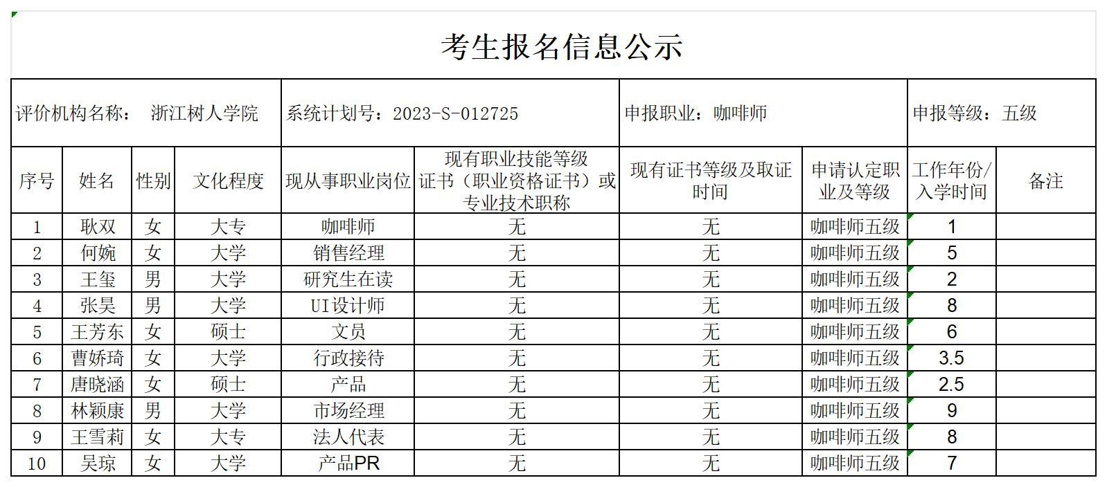 现将通过2023-S-012725批次咖啡师初级工(五级)职业技能等级认定资格审核考生信息予以公示,公示期2024年1月8日至1月12日,如对公示情况有异议,请提供有效证据,并实名电话或书面联系公司职业技能认定中心。