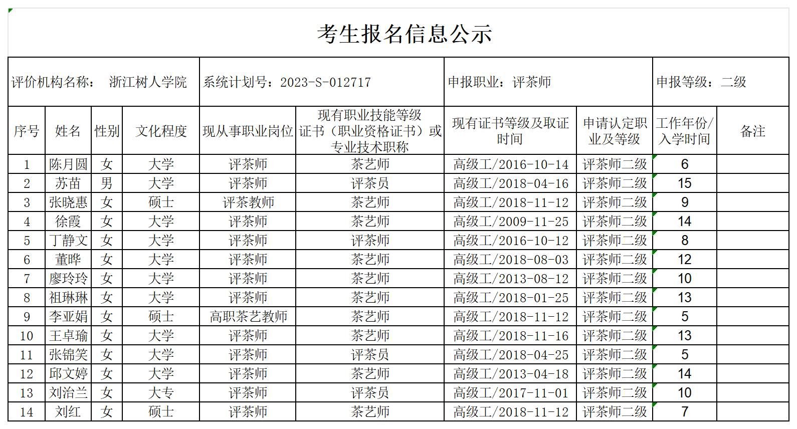 现将通过2023-S-012717批次评茶师技师(二级)职业技能等级认定资格审核考生信息予以公示,公示期2024年1月8日至1月12日,如对公示情况有异议,请提供有效证据,并实名电话或书面联系公司职业技能认定中心。