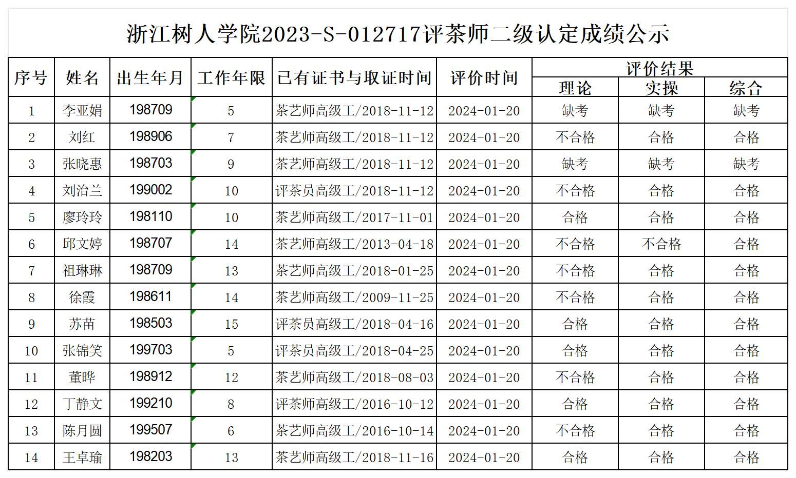 根据《浙江省人力资源和社会保障厅办公室关于印发<浙江省社会评价组织职业技能等级认定操作指南(试行)>的通知》,经审核,现将2023-S-012717批次评茶师二级职业技能等级认定成绩予以公示,公示期2024年1月25日至1月31日,如对公示情况有异议,请提供有效证据,并实名电话或书面联系公司职业技能认定中心。