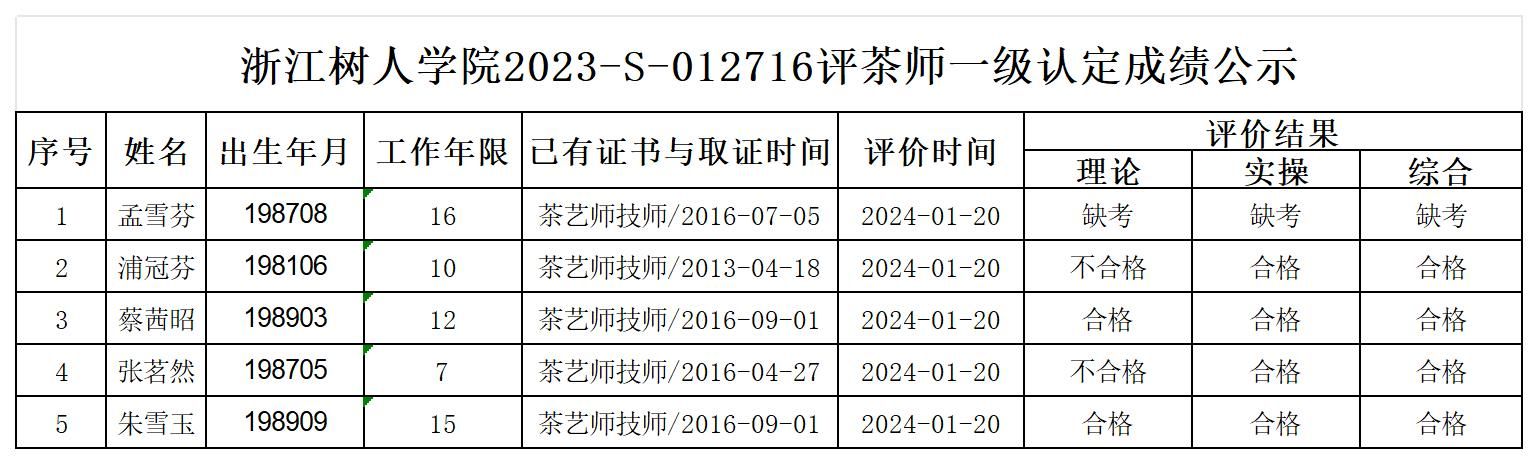 根据《浙江省人力资源和社会保障厅办公室关于印发<浙江省社会评价组织职业技能等级认定操作指南(试行)>的通知》,经审核,现将2023-S-012716批次评茶师一级职业技能等级认定成绩予以公示,公示期2024年1月25日至1月31日,如对公示情况有异议,请提供有效证据,并实名电话或书面联系公司职业技能认定中心。
