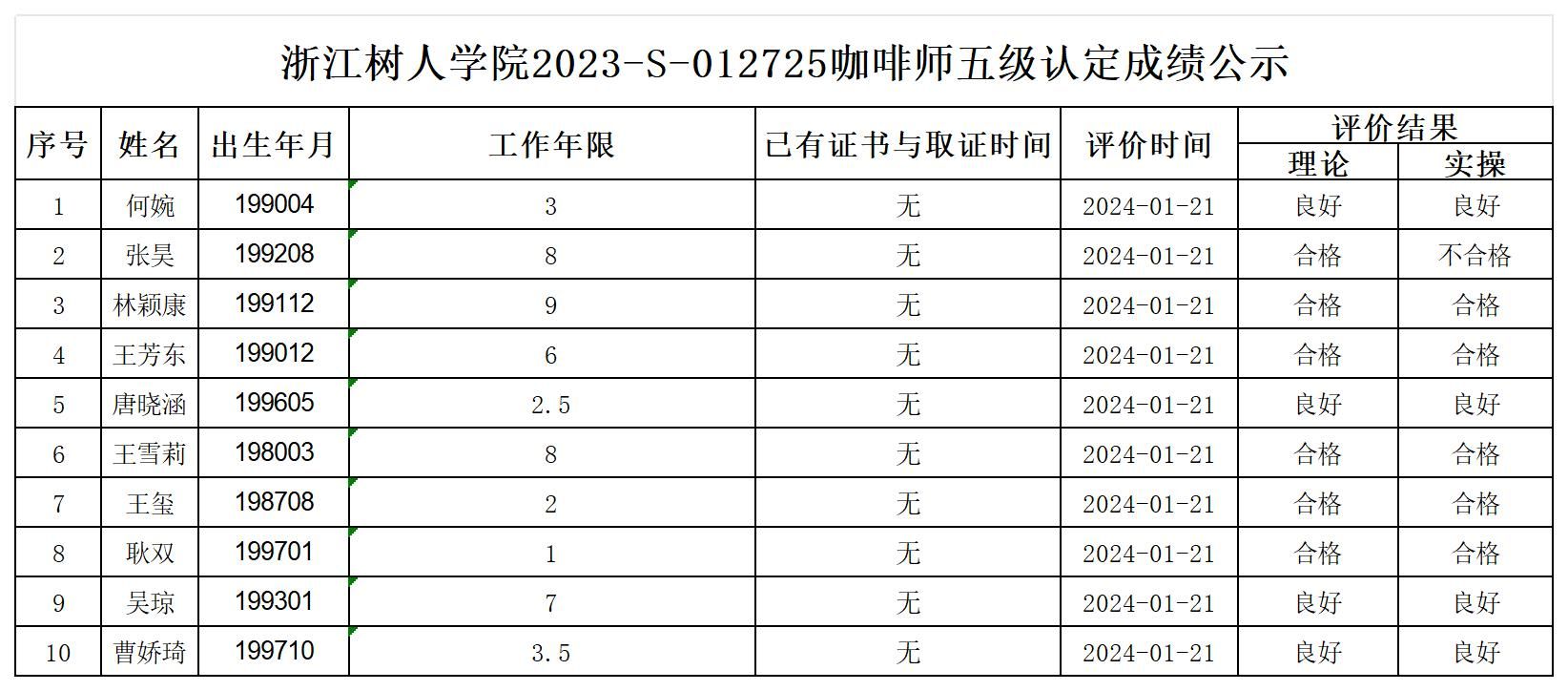 根据《浙江省人力资源和社会保障厅办公室关于印发<浙江省社会评价组织职业技能等级认定操作指南(试行)>的通知》,经审核,现将2023-S-012725批次咖啡师五级职业技能等级认定成绩予以公示,公示期2024年1月25日至1月31日,如对公示情况有异议,请提供有效证据,并实名电话或书面联系公司职业技能认定中心。