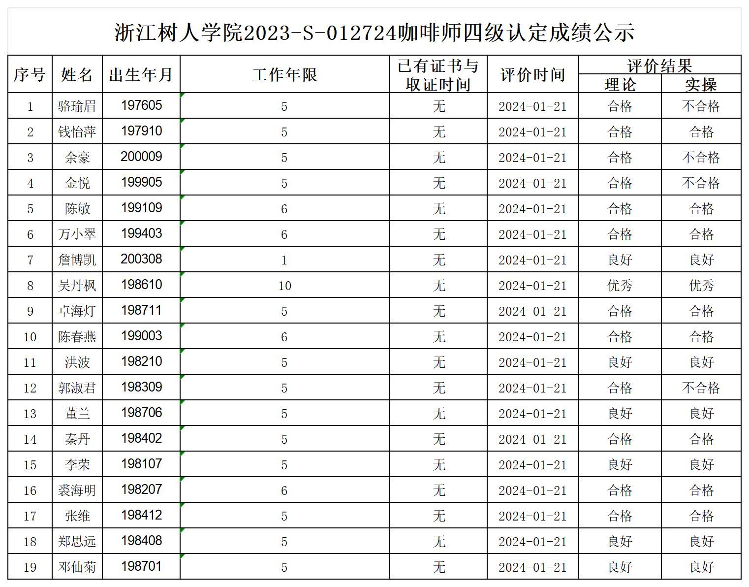 根据《浙江省人力资源和社会保障厅办公室关于印发<浙江省社会评价组织职业技能等级认定操作指南(试行)>的通知》,经审核,现将2023-S-012724批次咖啡师四级职业技能等级认定成绩予以公示,公示期2024年1月25日至1月31日,如对公示情况有异议,请提供有效证据,并实名电话或书面联系公司职业技能认定中心。