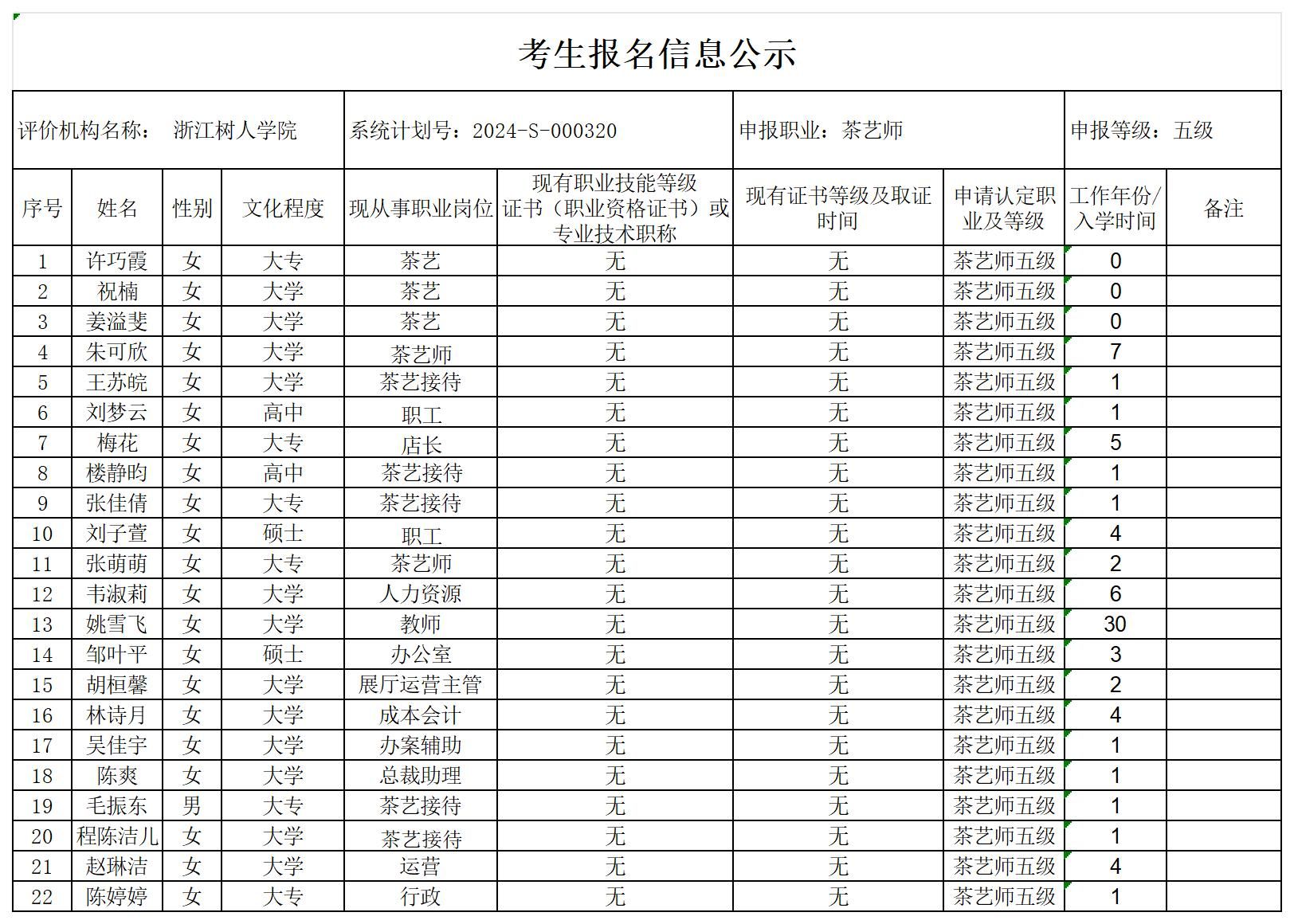 现将通过2024-S-000320批次茶艺师初级工(五级)职业技能等级认定资格审核考生信息予以公示,公示期2024年3月11日至3月15日,如对公示情况有异议,请提供有效证据,并实名电话或书面联系公司职业技能认定中心。