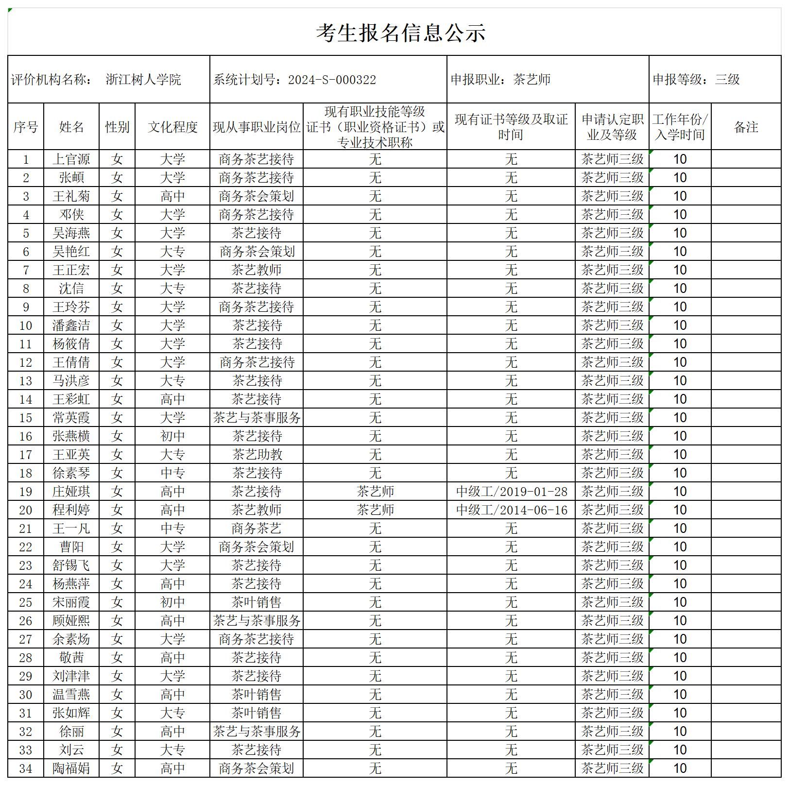 现将通过2024-S-000322批次茶艺师高级工(三级)职业技能等级认定资格审核考生信息予以公示,公示期2024年3月11日至3月15日,如对公示情况有异议,请提供有效证据,并实名电话或书面联系公司职业技能认定中心。