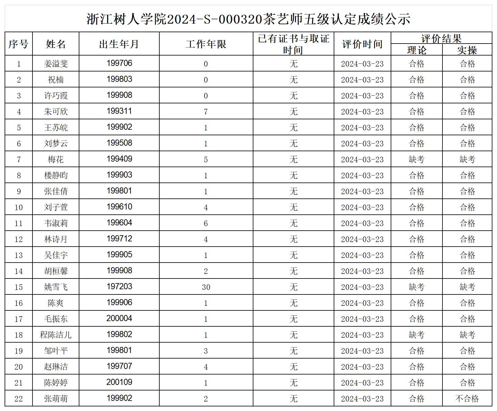 根据《浙江省人力资源和社会保障厅办公室关于印发<浙江省社会评价组织职业技能等级认定操作指南(试行)>的通知》,经审核,现将2024-S-000320批次茶艺师五级职业技能等级认定成绩予以公示,公示期2024年3月27日至4月2日,如对公示情况有异议,请提供有效证据,并实名电话或书面联系公司职业技能认定中心。