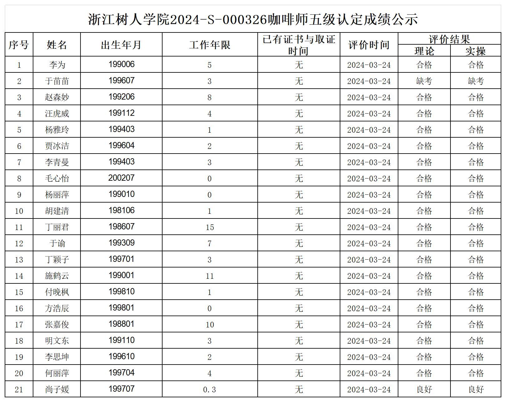 根据《浙江省人力资源和社会保障厅办公室关于印发<浙江省社会评价组织职业技能等级认定操作指南(试行)>的通知》,经审核,现将2024-S-000326批次咖啡师五级职业技能等级认定成绩予以公示,公示期2024年3月27日至4月2日,如对公示情况有异议,请提供有效证据,并实名电话或书面联系公司职业技能认定中心。