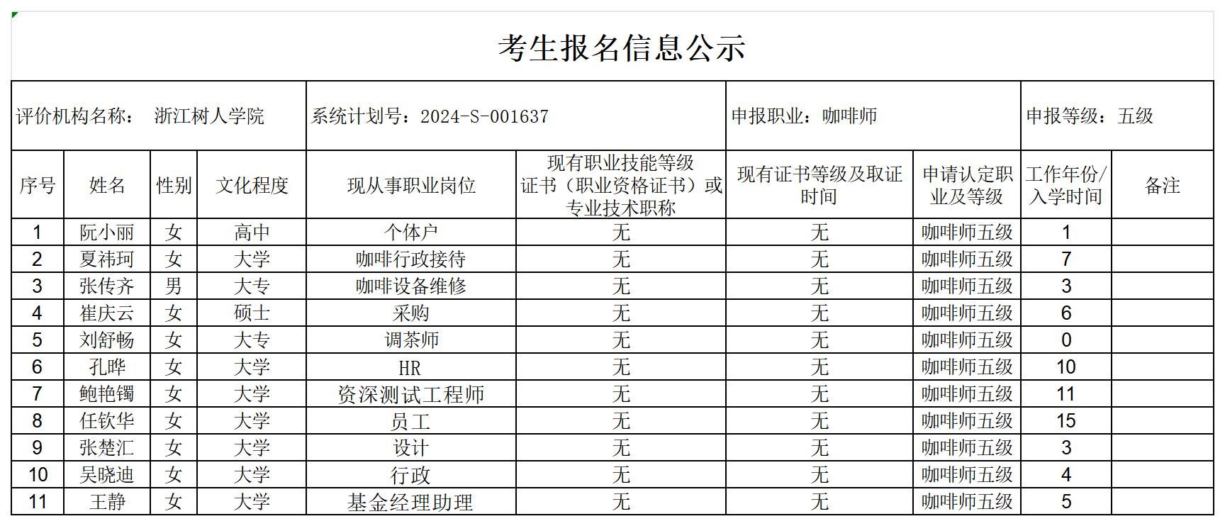 现将通过2024-S-001637批次咖啡师初级工(五级)职业技能等级认定资格审核考生信息予以公示,公示期2024年4月8日至4月12日,如对公示情况有异议,请提供有效证据,并实名电话或书面联系公司职业技能认定中心。
