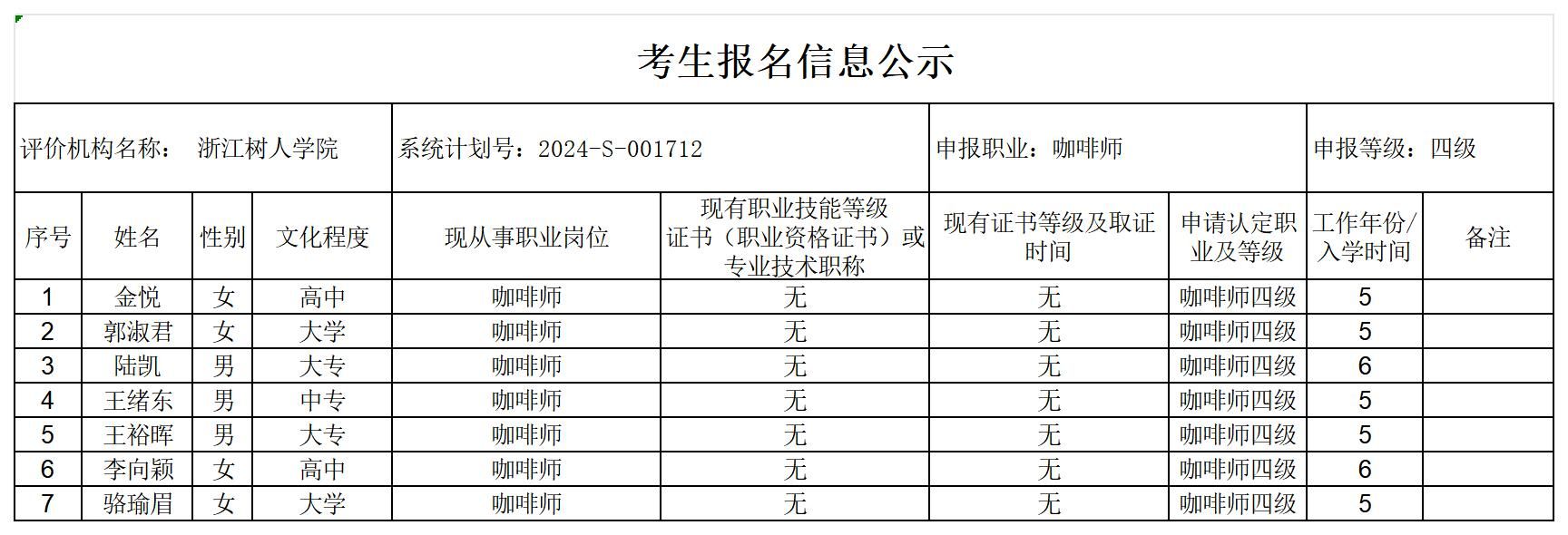 现将通过2024-S-001712批次咖啡师中级工(四级)职业技能等级认定资格审核考生信息予以公示,公示期2024年4月8日至4月12日,如对公示情况有异议,请提供有效证据,并实名电话或书面联系公司职业技能认定中心。