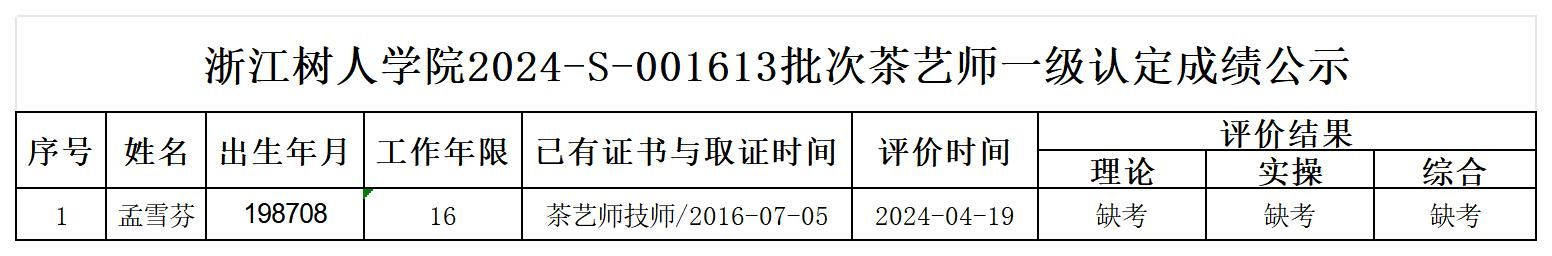 根据《浙江省人力资源和社会保障厅办公室关于印发<浙江省社会评价组织职业技能等级认定操作指南(试行)>的通知》,经审核,现将2024-S-001613批次茶艺师一级职业技能等级认定成绩予以公示,公示期2024年4月24日至4月29日,如对公示情况有异议,请提供有效证据,并实名电话或书面联系公司职业技能认定中心。