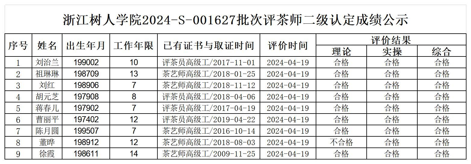 根据《浙江省人力资源和社会保障厅办公室关于印发<浙江省社会评价组织职业技能等级认定操作指南(试行)>的通知》,经审核,现将2024-S-001627批次评茶师二级职业技能等级认定成绩予以公示,公示期2024年4月24日至4月29日,如对公示情况有异议,请提供有效证据,并实名电话或书面联系公司职业技能认定中心。