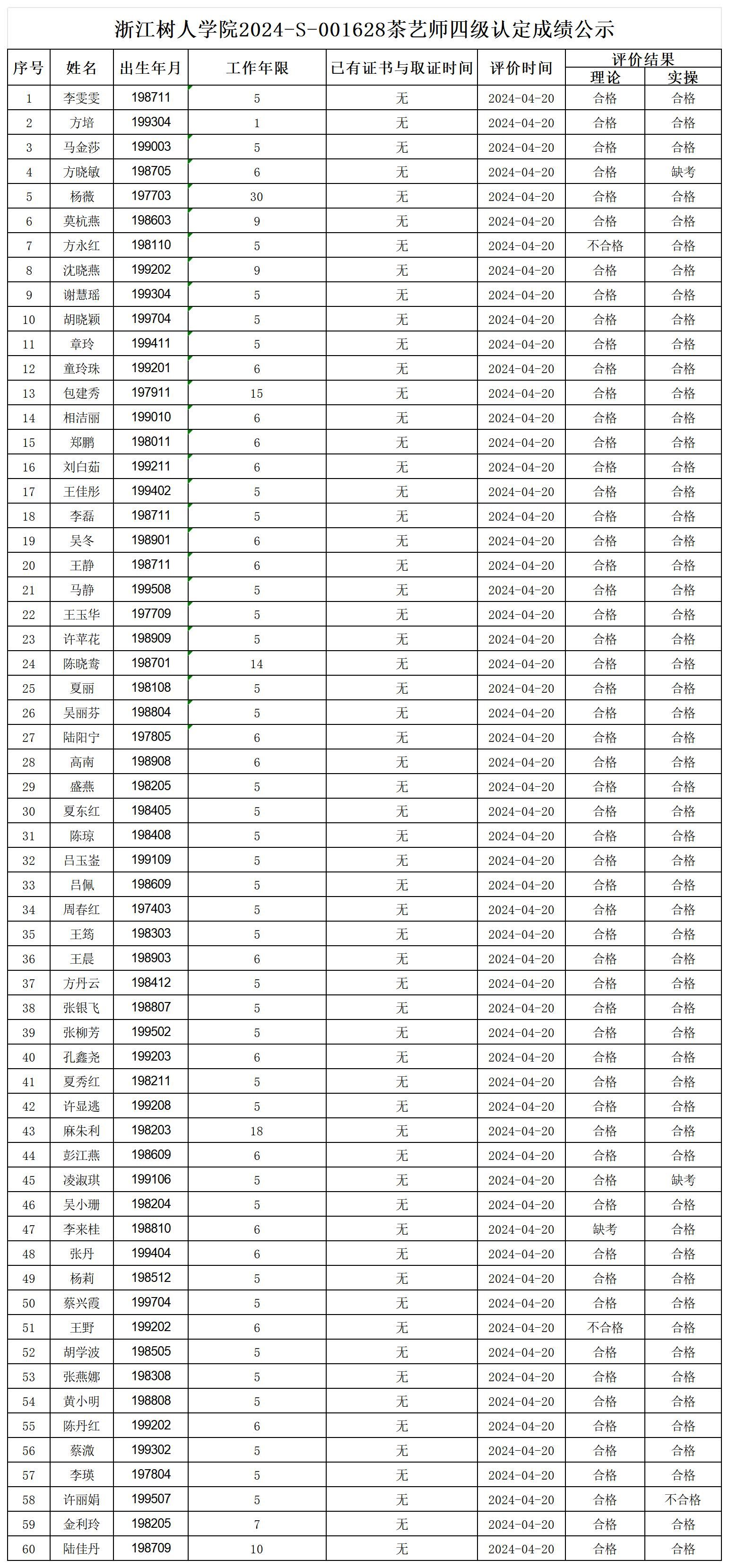 根据《浙江省人力资源和社会保障厅办公室关于印发<浙江省社会评价组织职业技能等级认定操作指南(试行)>的通知》,经审核,现将2024-S-001628批次茶艺师四级职业技能等级认定成绩予以公示,公示期2024年4月24日至4月29日,如对公示情况有异议,请提供有效证据,并实名电话或书面联系公司职业技能认定中心。
