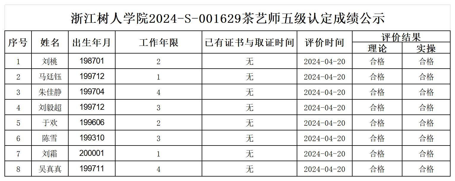 根据《浙江省人力资源和社会保障厅办公室关于印发<浙江省社会评价组织职业技能等级认定操作指南(试行)>的通知》,经审核,现将2024-S-001629批次茶艺师五级职业技能等级认定成绩予以公示,公示期2024年4月24日至4月29日,如对公示情况有异议,请提供有效证据,并实名电话或书面联系公司职业技能认定中心。