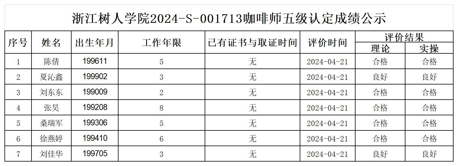 根据《浙江省人力资源和社会保障厅办公室关于印发<浙江省社会评价组织职业技能等级认定操作指南(试行)>的通知》,经审核,现将2024-S-001713批次咖啡师五级职业技能等级认定成绩予以公示,公示期2024年4月24日至4月29日,如对公示情况有异议,请提供有效证据,并实名电话或书面联系公司职业技能认定中心。