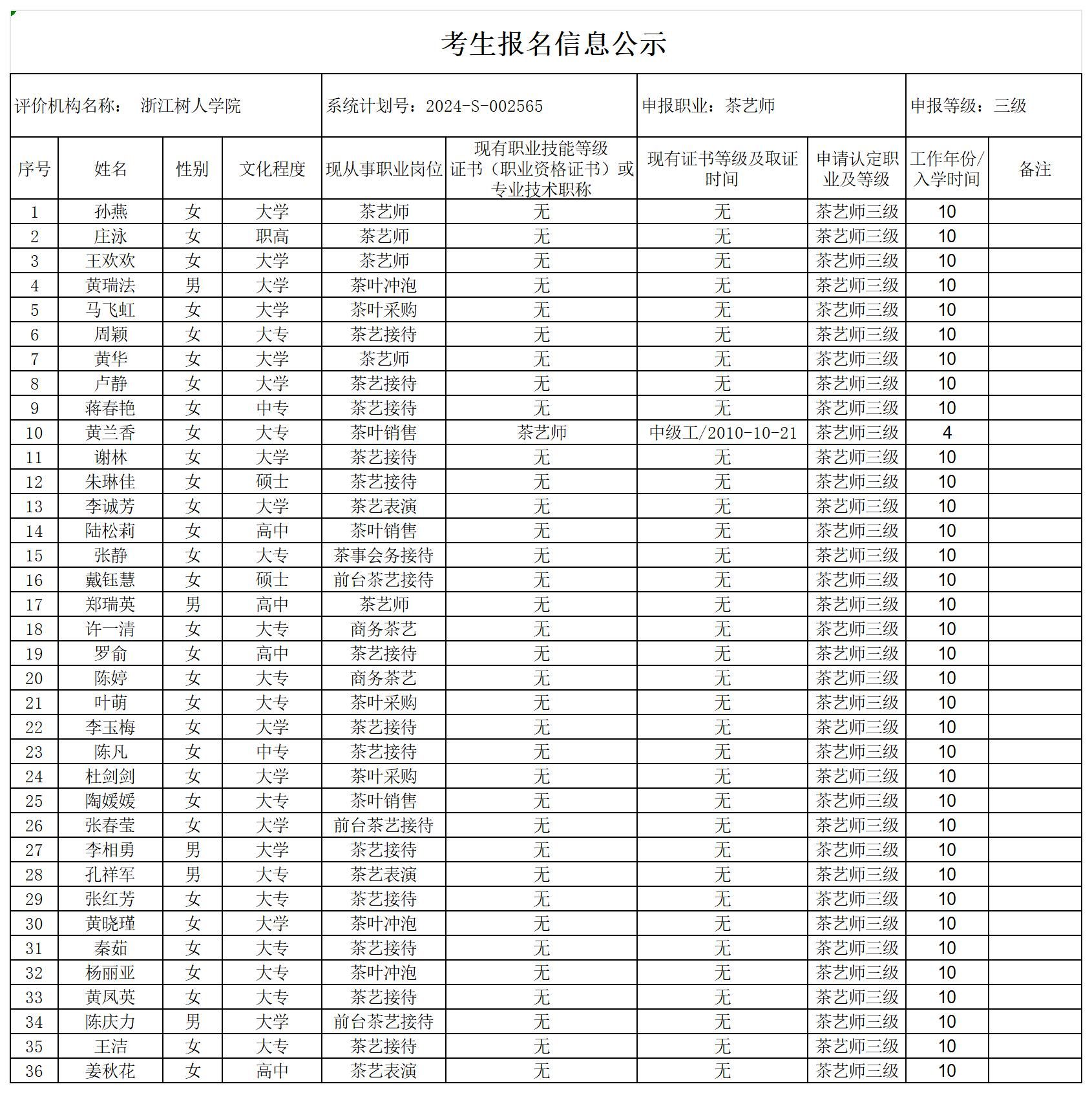 现将通过2024-S-002565批次茶艺师高级工(三级)职业技能等级认定资格审核考生信息予以公示,公示期2024年5月13日至5月17日,如对公示情况有异议,请提供有效证据,并实名电话或书面联系公司职业技能认定中心。