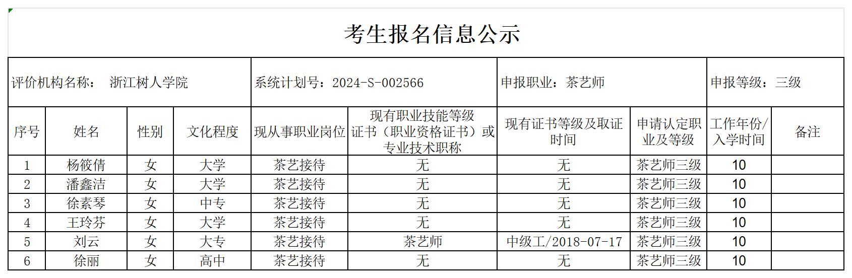 现将通过2024-S-002566批次茶艺师高级工(三级)职业技能等级认定资格审核考生信息予以公示,公示期2024年5月13日至5月17日,如对公示情况有异议,请提供有效证据,并实名电话或书面联系公司职业技能认定中心。
