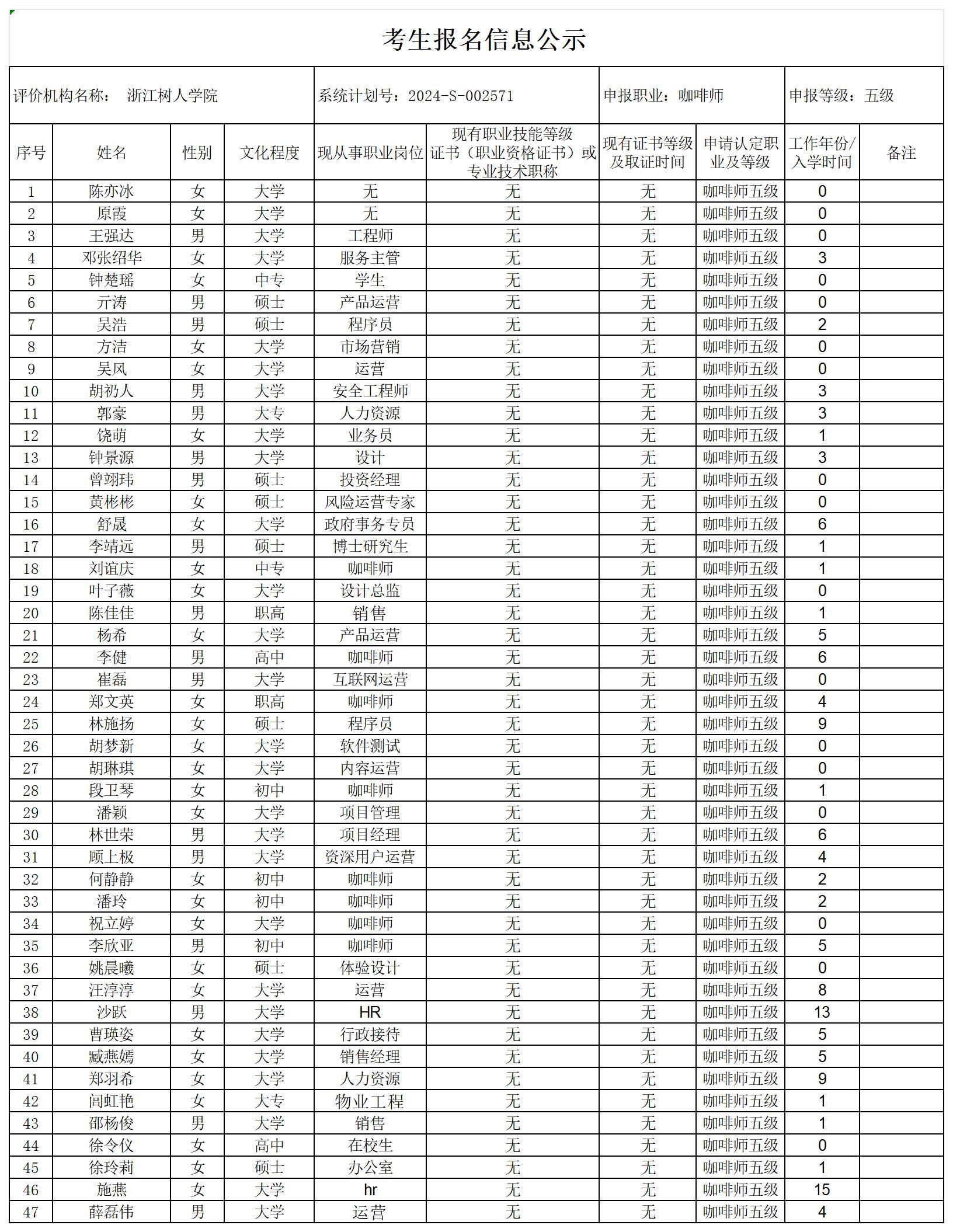 现将通过2024-S-002571批次咖啡师初级工(五级)职业技能等级认定资格审核考生信息予以公示,公示期2024年5月13日至5月17日,如对公示情况有异议,请提供有效证据,并实名电话或书面联系公司职业技能认定中心。