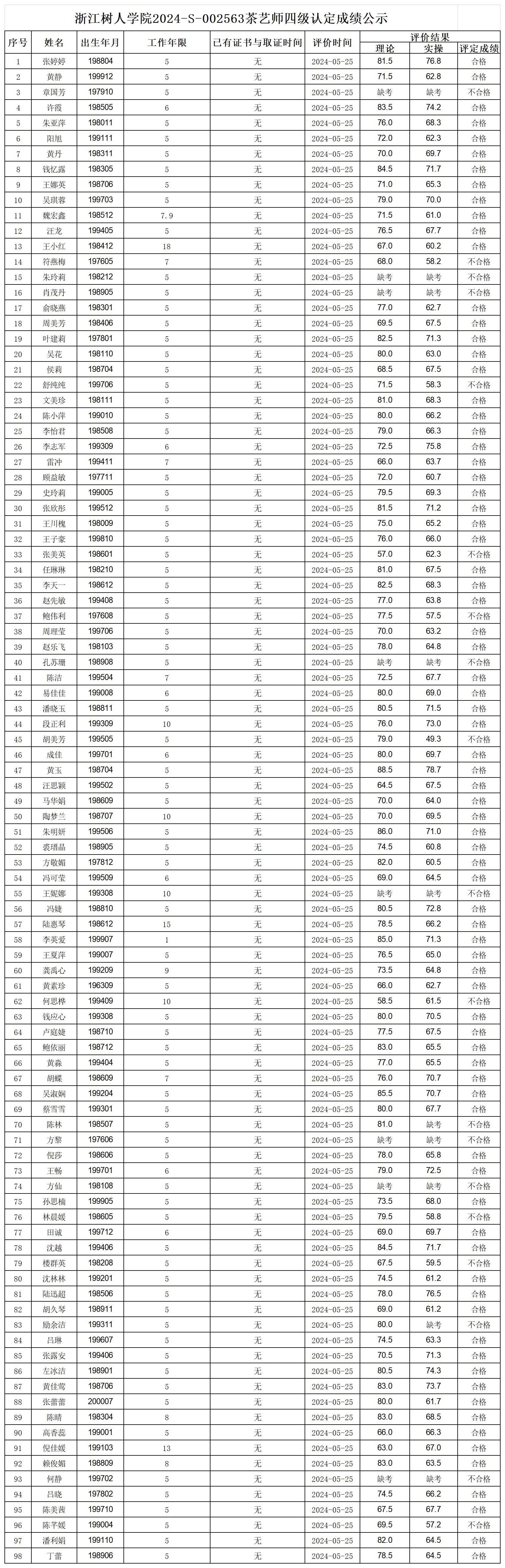 根据《浙江省人力资源和社会保障厅办公室关于印发<浙江省社会评价组织职业技能等级认定操作指南(试行)>的通知》,经审核,现将2024-S-002563批次茶艺师四级职业技能等级认定成绩予以公示,公示期2024年5月29日至6月4日,如对公示情况有异议,请提供有效证据,并实名电话或书面联系公司职业技能认定中心。