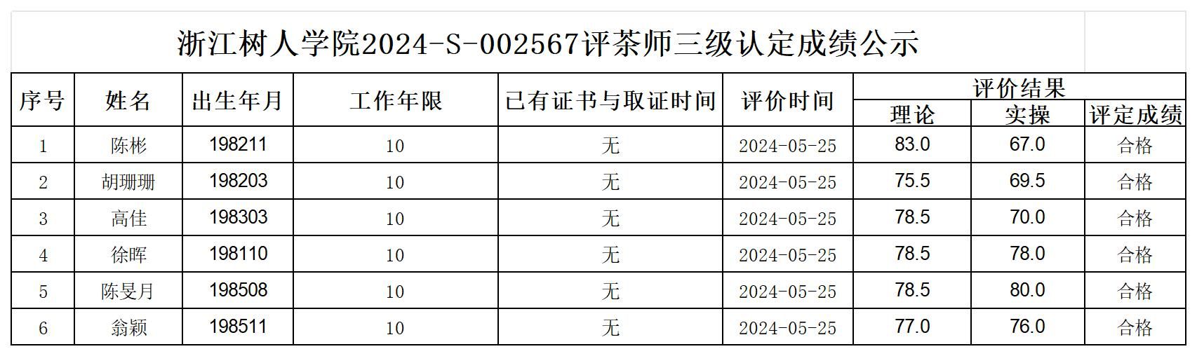 根据《浙江省人力资源和社会保障厅办公室关于印发<浙江省社会评价组织职业技能等级认定操作指南(试行)>的通知》,经审核,现将2024-S-002567批次评茶师三级职业技能等级认定成绩予以公示,公示期2024年5月29日至6月4日,如对公示情况有异议,请提供有效证据,并实名电话或书面联系公司职业技能认定中心。