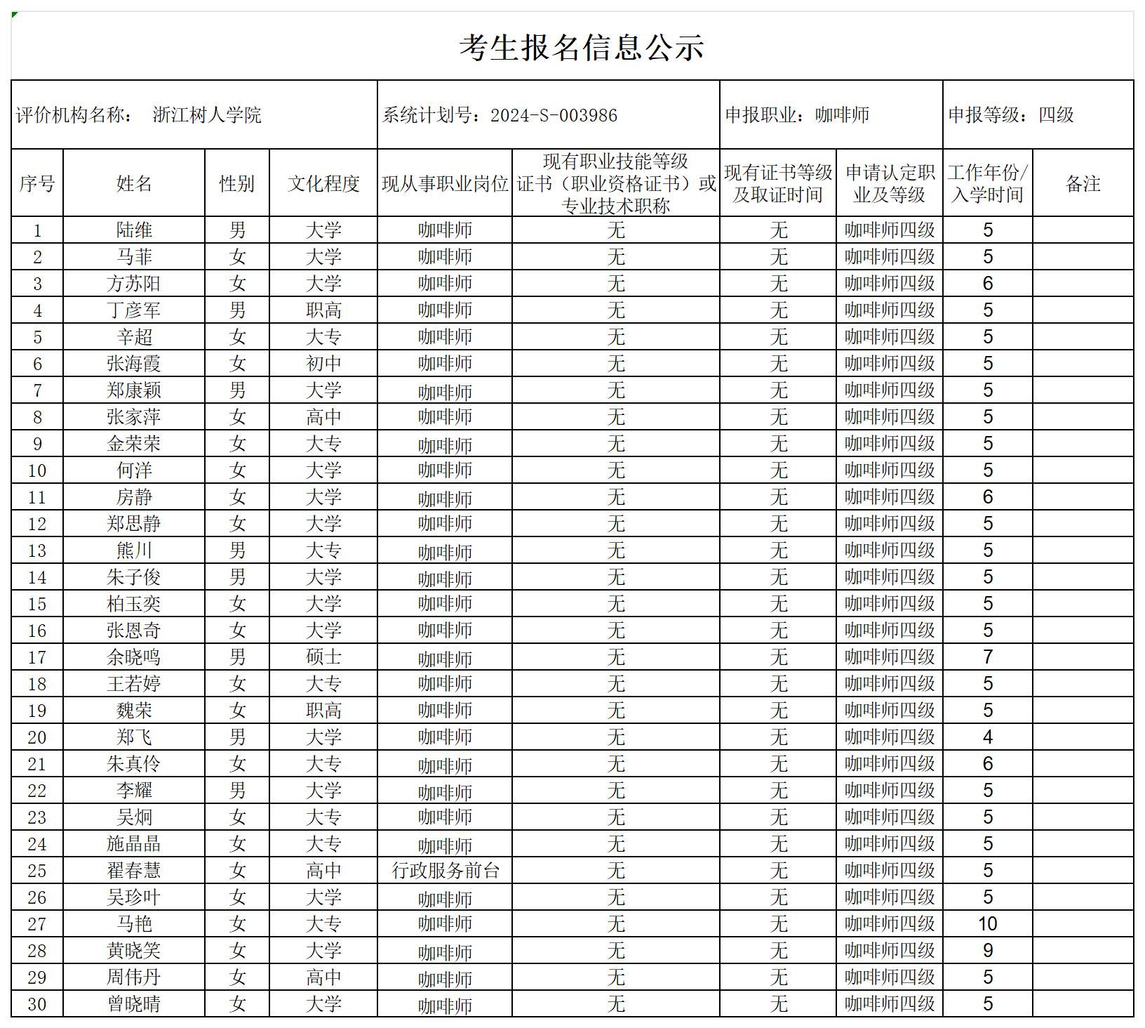 现将通过2024-S-003986批次咖啡师中级工(四级)职业技能等级认定资格审核考生信息予以公示,公示期2024年6月11日至6月17日,如对公示情况有异议,请提供有效证据,并实名电话或书面联系公司职业技能认定中心。