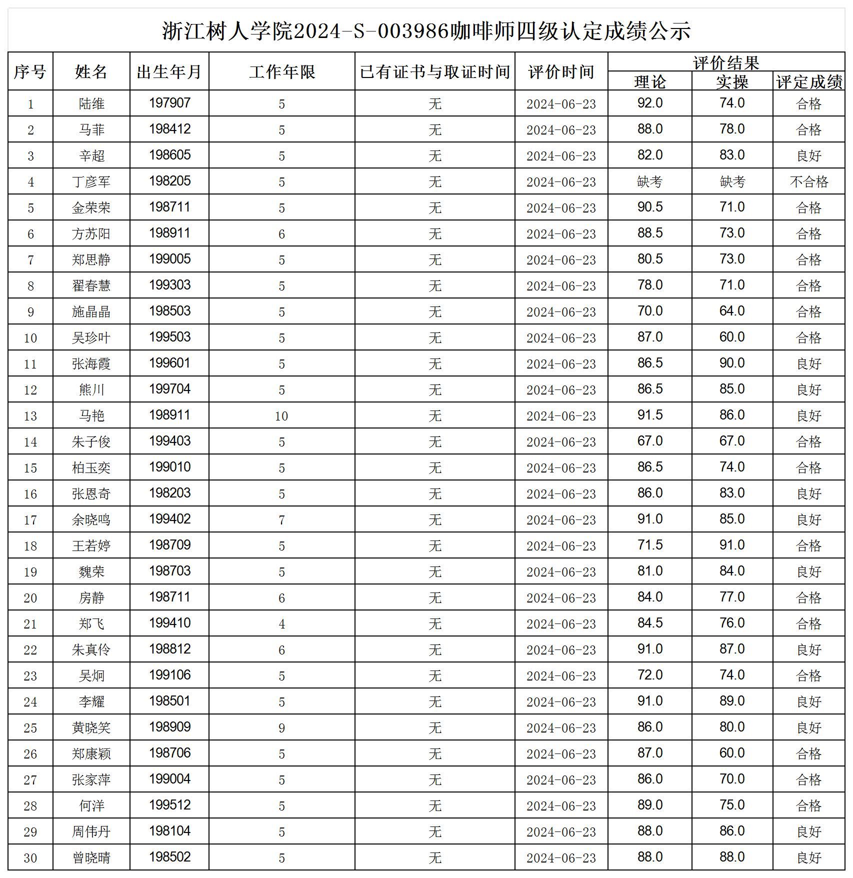 根据《浙江省人力资源和社会保障厅办公室关于印发<浙江省社会评价组织职业技能等级认定操作指南(试行)>的通知》,经审核,现将2024-S-003986批次咖啡师四级职业技能等级认定成绩予以公示,公示期2024年6月26日至7月2日,如对公示情况有异议,请提供有效证据,并实名电话或书面联系公司职业技能认定中心。
