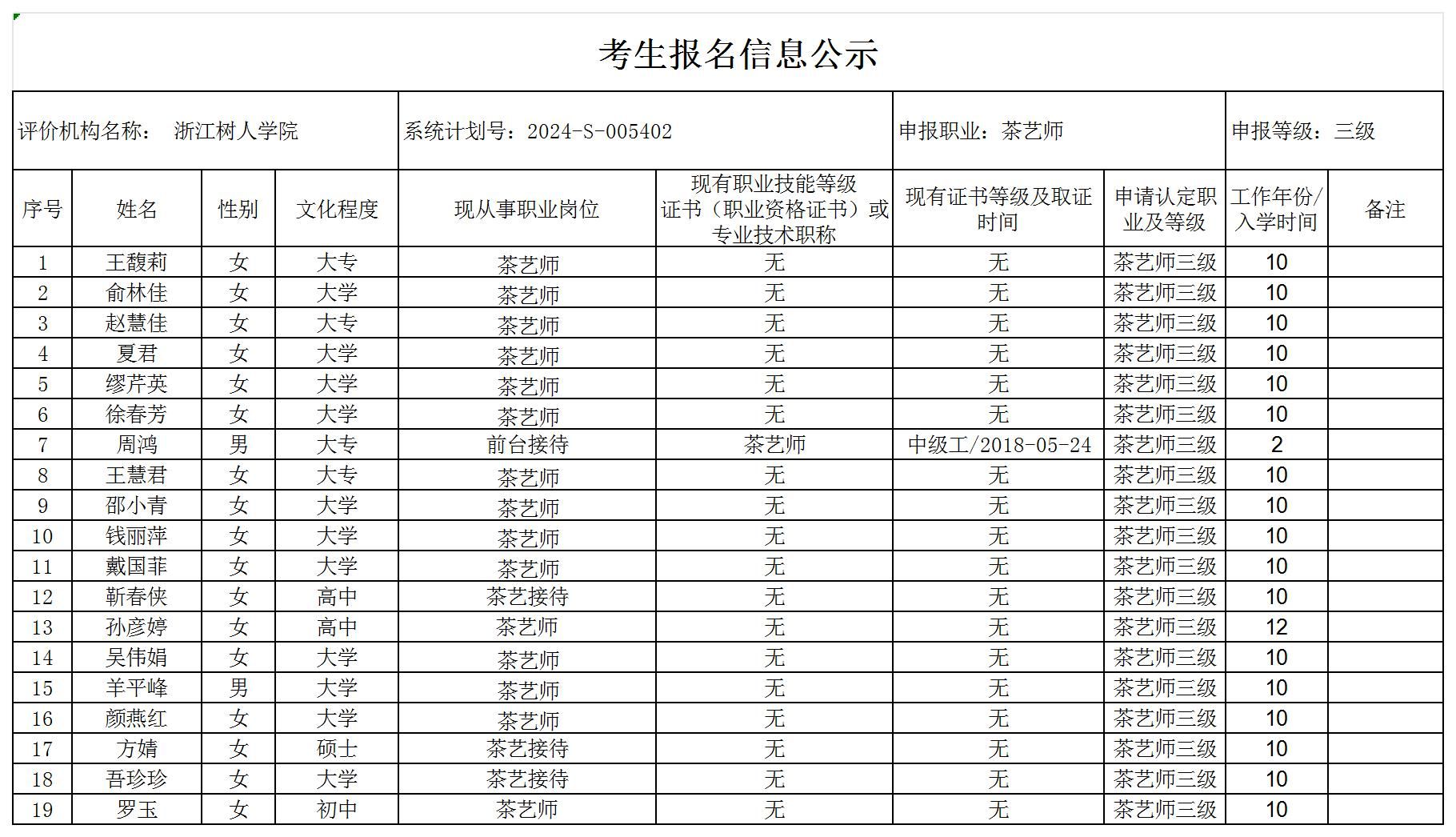 现将通过2024-S-005402批次茶艺师高级工(三级)职业技能等级认定资格审核考生信息予以公示,公示期2024年7月8日至7月12日,如对公示情况有异议,请提供有效证据,并实名电话或书面联系公司职业技能认定中心。