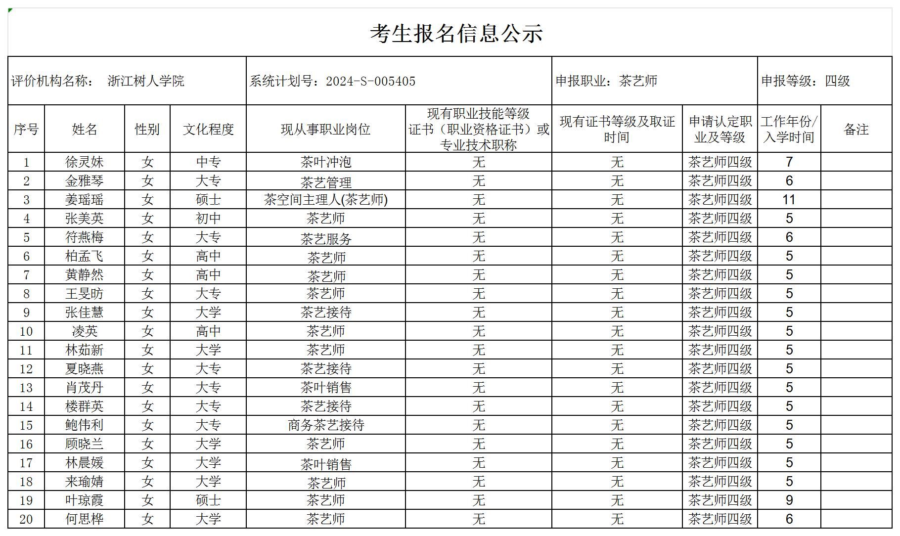 现将通过2024-S-005405批次茶艺师中级工(四级)职业技能等级认定资格审核考生信息予以公示,公示期2024年7月8日至7月12日,如对公示情况有异议,请提供有效证据,并实名电话或书面联系公司职业技能认定中心。
