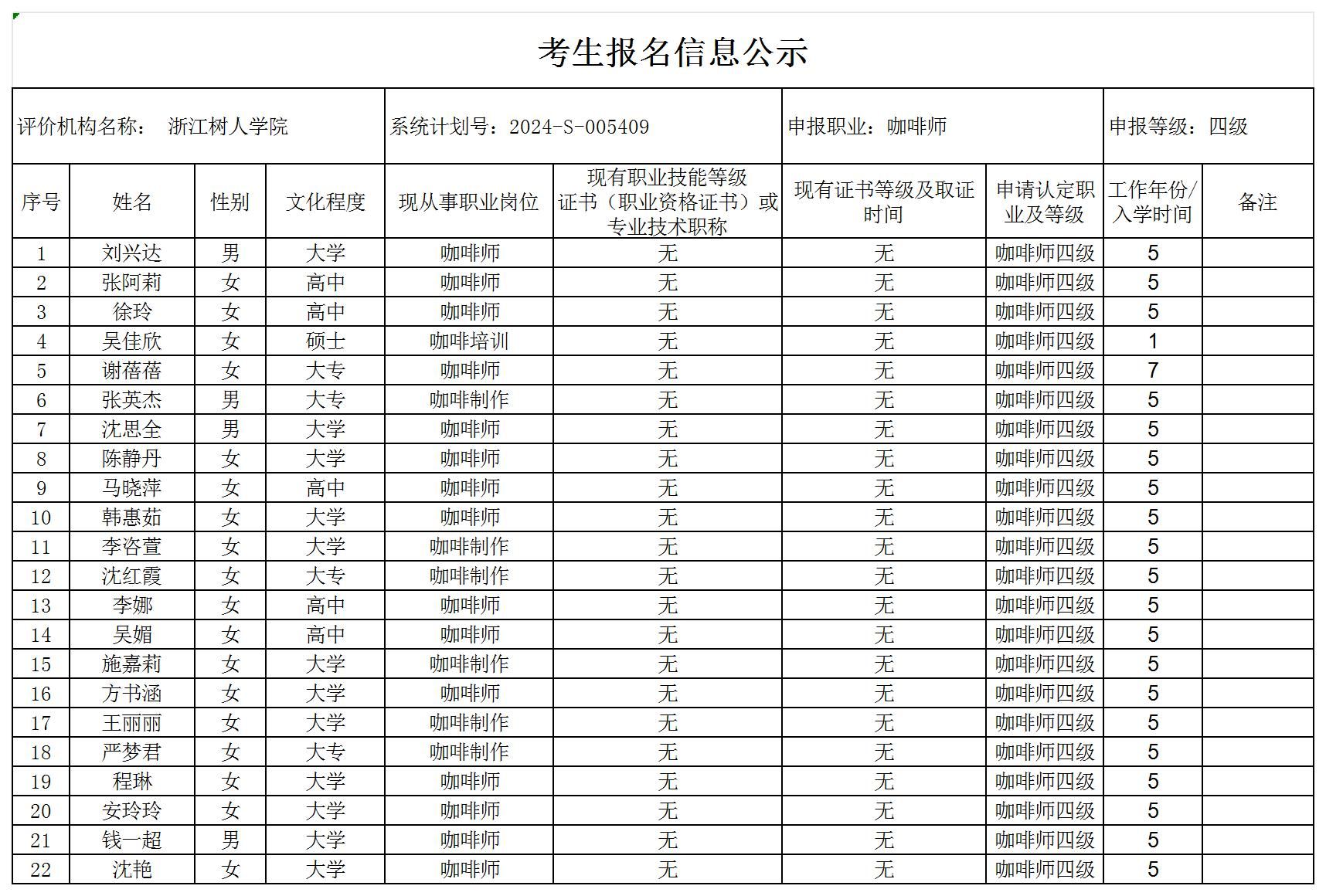 现将通过2024-S-005409批次咖啡师中级工(四级)职业技能等级认定资格审核考生信息予以公示,公示期2024年7月8日至7月12日,如对公示情况有异议,请提供有效证据,并实名电话或书面联系公司职业技能认定中心。