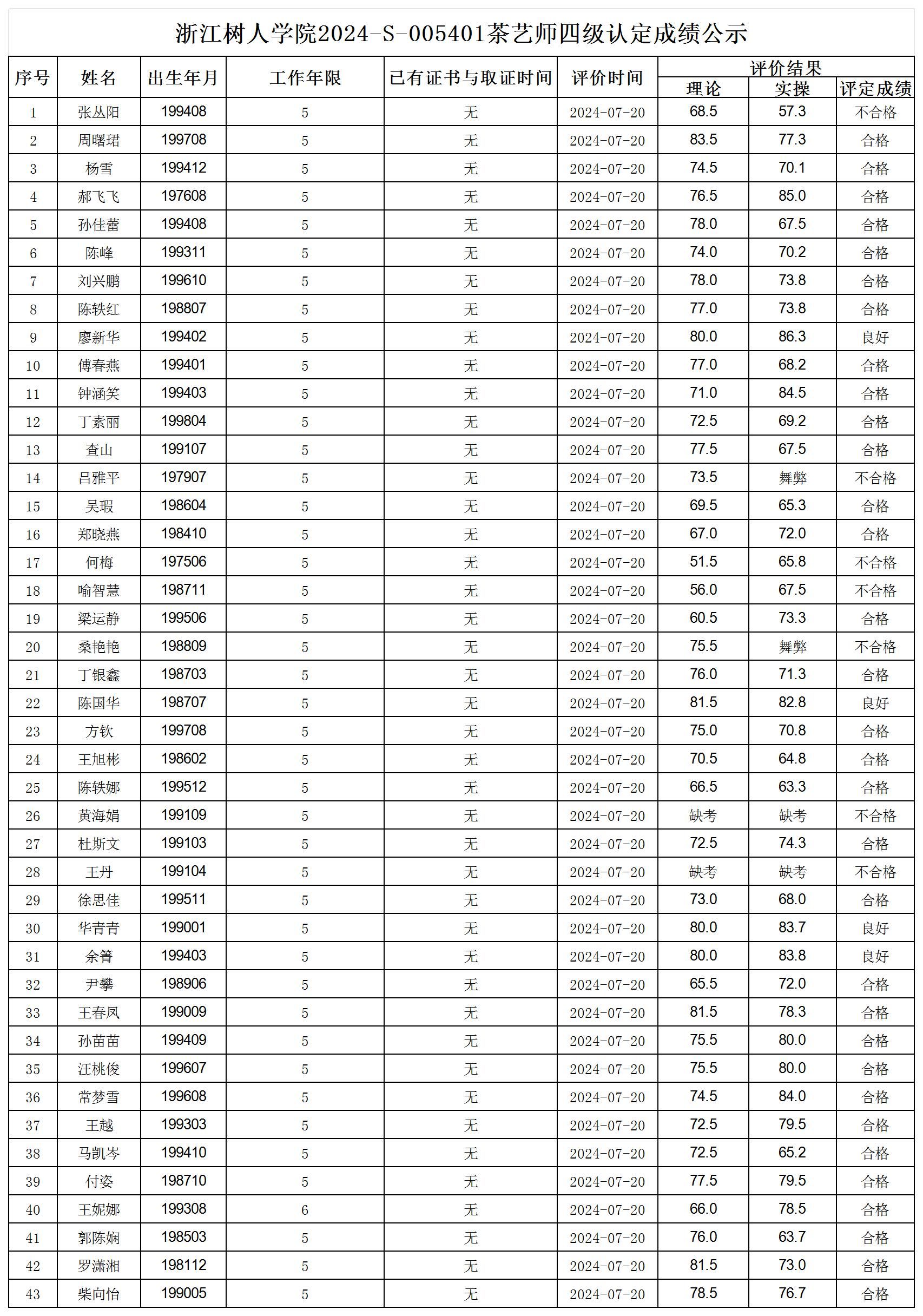 根据《浙江省人力资源和社会保障厅办公室关于印发<浙江省社会评价组织职业技能等级认定操作指南(试行)>的通知》,经审核,现将2024-S-005401批次茶艺师四级职业技能等级认定成绩予以公示,公示期2024年7月24日至7月30日,如对公示情况有异议,请提供有效证据,并实名电话或书面联系公司职业技能认定中心。