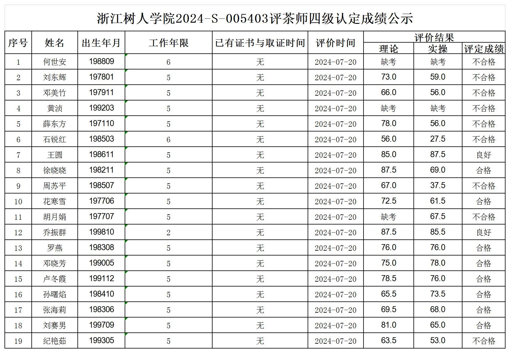根据《浙江省人力资源和社会保障厅办公室关于印发<浙江省社会评价组织职业技能等级认定操作指南(试行)>的通知》,经审核,现将2024-S-005403批次评茶师四级职业技能等级认定成绩予以公示,公示期2024年7月24日至7月30日,如对公示情况有异议,请提供有效证据,并实名电话或书面联系公司职业技能认定中心。